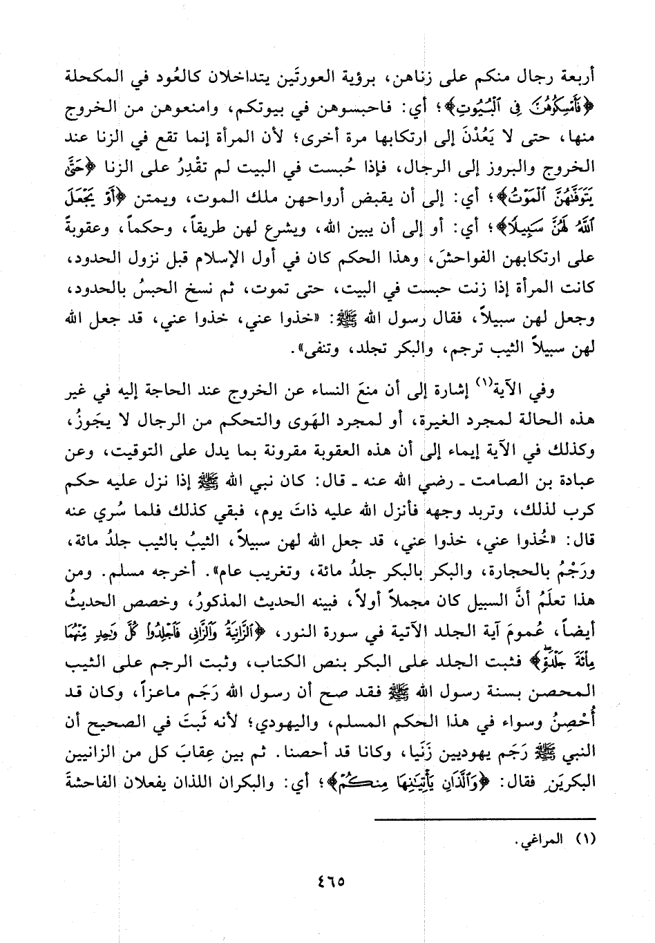 وفي الآية (¬1) إشارة إلى أن منعَ النساء عن الخروج عند الحاجة إليه في غير هذه الحالة لمجرد الغيرة، أو لمجرد الهَوى والتحكم من الرجال لا يجَوزُ، وكذلك في الآية إيماء إلى أن هذه العقوبة مقرونة بما يدل على التوقيت، وعن عبادة بن الصامت - رضي الله عنه - قال: كان نبي الله - صلى الله عليه وسلم - إذا نزل عليه حكم كرب لذلك، وتربد وجهه فأنزل الله عليه ذاتَ يوم، فبقي كذلك فلما سُري عنه قال: "خُذوا عني، خذوا عني، قد جعل الله لهن سبيلًا، الثيبُ بالثيب جلدُ مائة، ورَجْمُ بالحجارة، والبكر بالبكر جلدُ مائة، وتغريب عام". أخرجه مسلم. ومن هذا تعلَمُ أنَّ السبيل كان مجملًا أولًا، فبينه الحديث المذكورُ، وخصص الحديثُ أيضًا، عُمومَ آية الجلد الآتية في سورة النور، {الزَّانِيَةُ وَالزَّانِي فَاجْلِدُوا كُلَّ وَاحِدٍ مِنْهُمَا مِائَةَ جَلْدَةٍ} فثبت الجلد على البكر بنص الكتاب، وثبت الرجم على الثيب المحصن بسنة رسول الله - صلى الله عليه وسلم - فقد صح أن رسول الله رَجَم ماعزًا، وكان قد أُحْصِنُ وسواء في هذا الحكم المسلم، واليهودي؛ لأنه ثَبتَ في الصحيح أن النبي - صلى الله عليه وسلم - رَجَم يهوديين زَنَيا، وكانا قد أحصنا.
