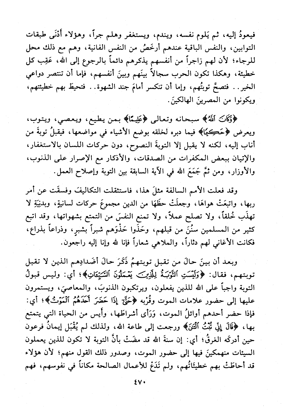 18 - وبعد أن بينَ حالَ من تقبل توبتهمُ ذَكَرَ حالَ أضَدادِهم الذين لا تقبل توبتهم، فقال: {وَلَيْسَتِ التَّوْبَةُ لِلَّذِينَ يَعْمَلُونَ السَّيِّئَاتِ}؛ أي: وليس قبولُ التوبة واجبًا على الله للذين يفعلون، ويرتكبون الذنوبَ، والمعاصيَ، ويستمرون عليها إلى حضور علامات الموت وقُرْبه {حَتَّى إِذَا حَضَرَ أَحَدَهُمُ الْمَوْتُ}؛ أي: فإذا حضر أحدهم أوائلُ الموت، وَرَأى أشراطَها، وأيس من الحياة التي يتمتع بها، {قَالَ إِنِّي تُبْتُ الْآنَ} إلى طاعة الله، ولذلك لم يُقْبَل إيمانُ فرعون حين أدركَه الغرقُ؛ أي: إن سنةَ الله قد مضَتْ بأن التوبة لا تكون للذين يعملون السيئات منهمكينَ فيها إلى حضور الموت، وصدور ذلك القول منهم؛ لأن هؤلاء قد أحاطَتْ بهم خطيئَاتُهم، ولم تَدَعْ للأعمال الصالحة مكانًا في نفوسهم، فهم