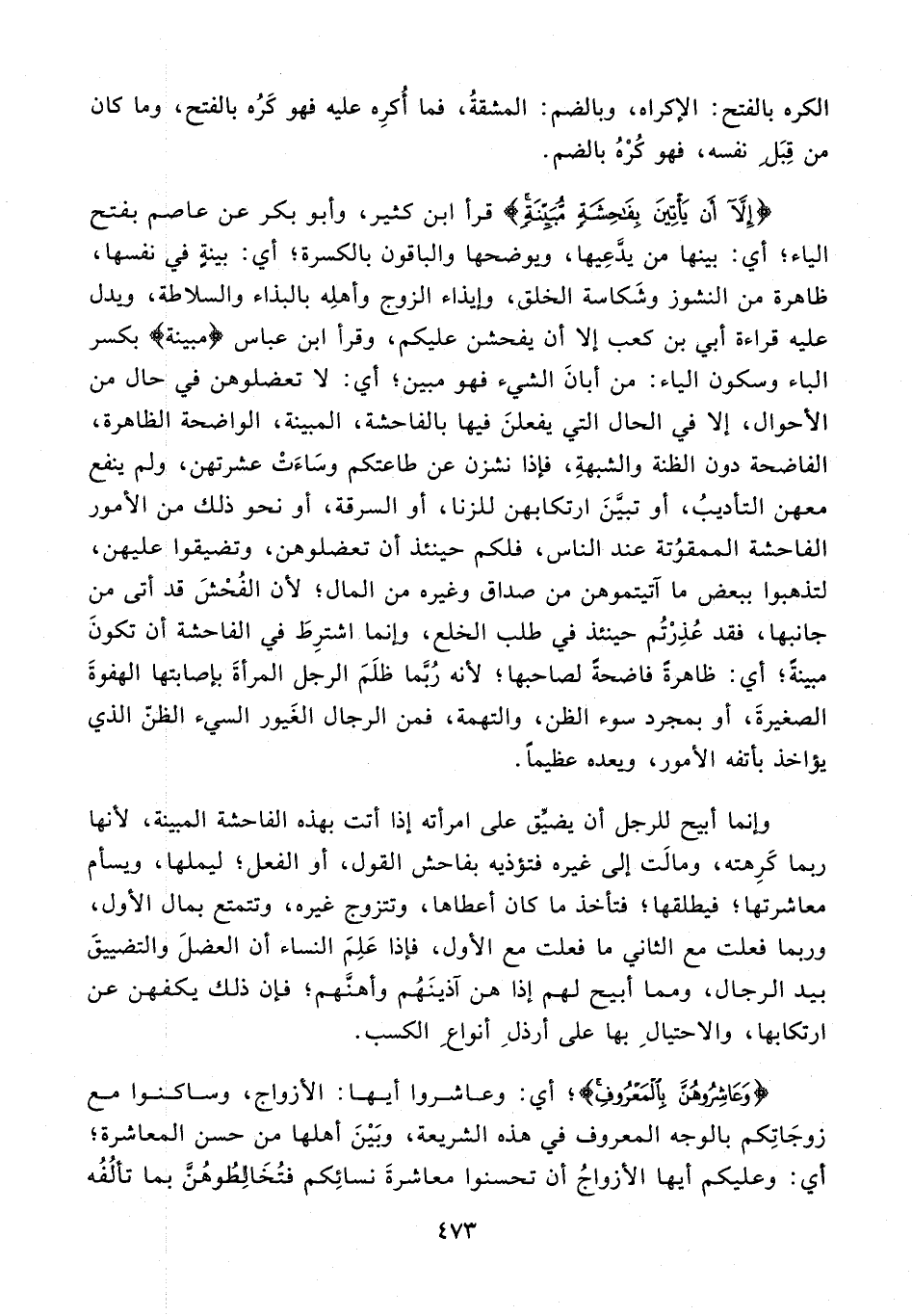 {إِلَّا أَنْ يَأتِينَ بِفَاحِشَةٍ مُبَيِّنَةٍ} قرأ ابن كثير، وأبو بكر عن عاصم بفتح الياء؛ أي: بينها من يدَّعِيها، ويوضحها والباقون بالكسرة؛ أي: بينةٍ في نفسها، ظاهرة من النشوز وشَكاسة الخلق، وإيذاء الزوج وأهلِه بالبذاء والسلاطة، ويدل عليه قراءة أبي بن كعب إلا أن يفحشن عليكم، وقرأ ابن عباس {مبينة} بكسر الباء وسكون الياء: من أبانَ الشيء فهو مبين؛ أي: لا تعضلوهن في حال من الأحوال، إلا في الحال التي يفعلنَ فيها بالفاحشة، المبينة، الواضحة الظاهرة، الفاضحة دون الظنة والشبهةِ، فإذا نشزن عن طاعتكم وسَاءَتْ عشرتهن، ولم ينفع معهن التأديبُ، أو تبيَّنَ ارتكابهن للزنا، أو السرقة، أو نحو ذلك من الأمور الفاحشة الممقوُتة عند الناس، فلكم حينئذ أن تعضلوهن، وتضيقوا عليهن، لتذهبوا ببعض ما آتيتموهن من صداق وغيره من المال؛ لأن الفُحْشَ قد أتى من جانبها، فقد عُذِرْتُم حينئذ في طلب الخلع، وإنما اشترِطَ في الفاحشة أن تكونَ مبينةً؛ أي: ظاهرةً فاضحةً لصاحبها؛ لأنه رُبَّما ظلَمَ الرجل المرأةَ بإصابتها الهفوةَ الصغيرةَ، أو بمجرد سوء الظن، والتهمة، فمن الرجال الغَيور السيء الظنّ الذي يؤاخذ بأتفه الأمور، ويعده عظيمًا.