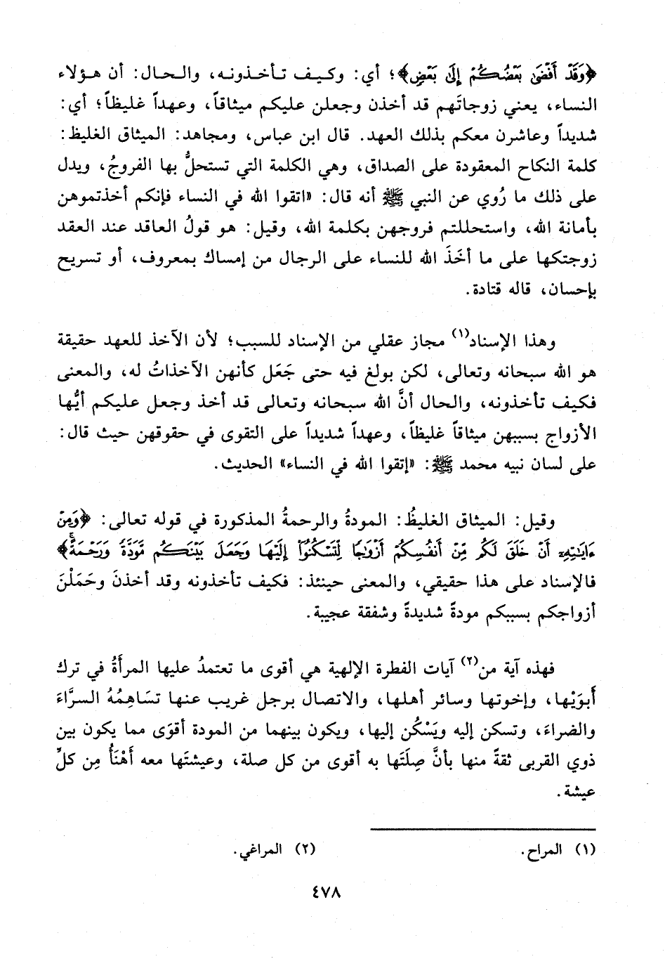 وقيل: الميثاق الغليظُ: المودةُ والرحمةُ المذكورة في قوله تعالى: {وَمِنْ آيَاتِهِ أَنْ خَلَقَ لَكُمْ مِنْ أَنْفُسِكُمْ أَزْوَاجًا لِتَسْكُنُوا إِلَيْهَا وَجَعَلَ بَيْنَكُمْ مَوَدَّةً وَرَحْمَةً} فالإسناد على هذا حقيقي، والمعنى حينئذ: فكيف تأخذونه وقد أخذنَ وحَمَلْنَ أزواجكم بسببكم مودةً شديدةً وشفقة عجيبة.