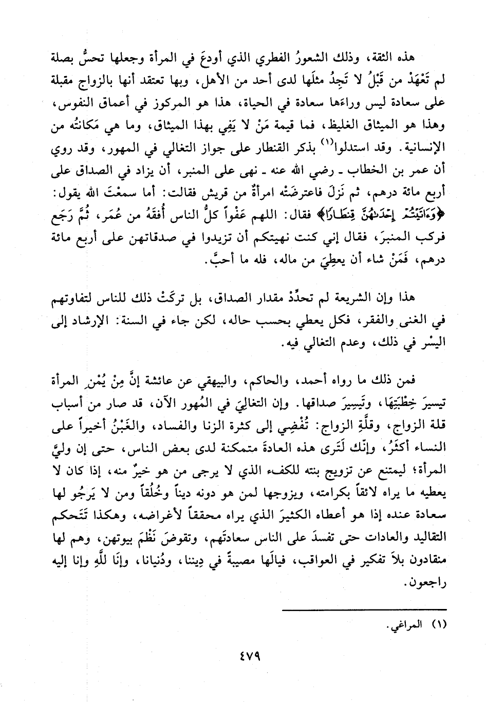 هذه الثقة، وذلك الشعورُ الفطري الذي أودعَ في المرأة وجعلها تحسُّ بصلة لم تَعْهَدْ من قَبْلُ لا تَجِدُ مثلَها لدى أحد من الأهل، وبها تعتقد أنها بالزواج مقبلة على سعادة ليس وراءَها سعادة في الحياة، هذا هو المركوز في أعماق النفوس، وهذا هو الميثاق الغليظ، فما قيمة مَنْ لا يَفِي بهذا الميثاق، وما هي مَكانتُه من الإنسانية. وقد استدلوا (¬1) بذكر القنطار على جواز التغالي في المهور، وقد روي أن عمر بن الخطاب - رضي الله عنه - نهى على المنبر، أن يزاد في الصداق على أربع مائة درهم، ثم نَزلَ فاعترضَتْه امرأةٌ من قريش فقالت: أما سمعْتَ الله يقول: {وَآتَيْتُمْ إِحْدَاهُنَّ قِنْطَارًا} فقال: اللهم عَفْوًا كلُّ الناس أَفْقَهُ من عُمَر، ثُمَّ رَجَع فركب المنبرَ، فقال إني كنت نهيتكم أن تزيدوا في صدقاتهن على أربع مائة درهم، فَمَنْ شاء أن يعطِيَ من ماله، فله ما أحبَّ.