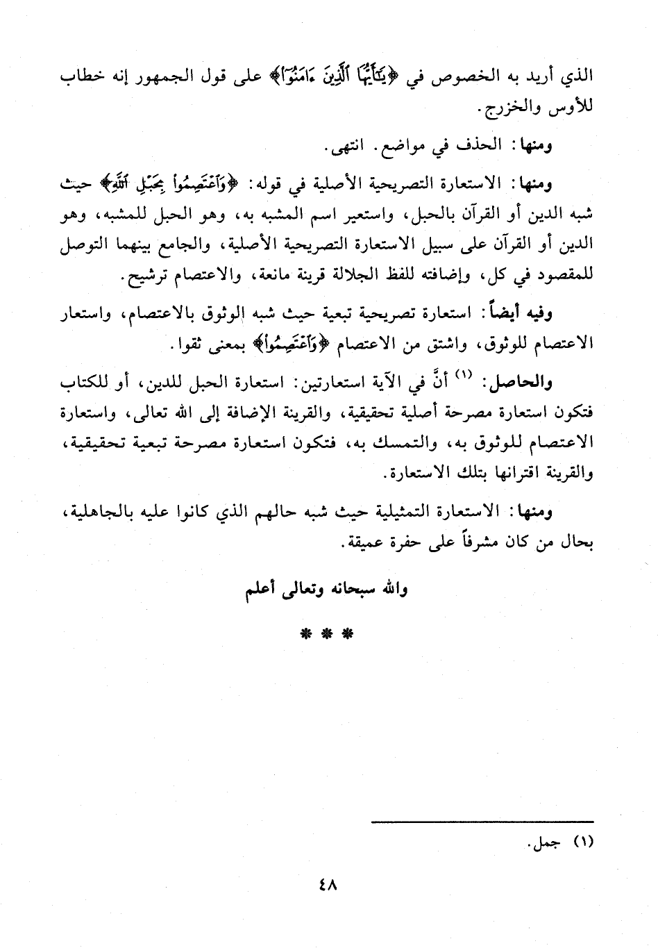 ومنها: الاستعارة التصريحية الأصلية في قوله: {وَاعْتَصِمُوا بِحَبْلِ اللَّهِ} حيث شبه الدين أو القرآن بالحبل، واستعير اسم المشبه به، وهو الحبل للمشبه، وهو الدين أو القرآن على سبيل الاستعارة التصريحية الأصلية، والجامع بينهما التوصل للمقصود في كل، وإضافته للفظ الجلالة قرينة مانعة، والاعتصام ترشيح.