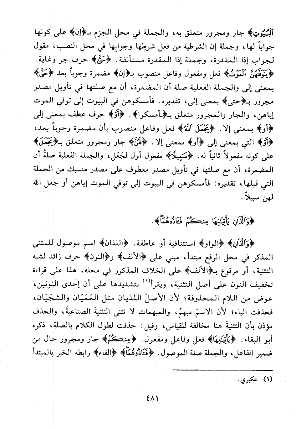 الْبُيُوتِ} جار ومجرور متعلق به، والجملة في محل الجزم بـ {إن} على كونها جوابًا لها، وجملة إن الشرطية من فعل شرطِها وجوابِها في محل النصب، مقول لجواب إذا المقدرة، وجملة إذا المقدرة مستأنفة. {حَتَّى} حرف جر وغاية. {يَتَوَفَّاهُنَّ الْمَوْتُ} فعل ومفعول وفاعل منصوب بـ {إن} مضمرة وجوبًا بعد {حَتَّى} بمعنى إلى والجملة الفعلية صلة أن المضمرة، أن مع صلتها في تأويل مصدر مجرور بـ {حتى} بمعنى إلى، تقديره. فأمسكوهن في البيوت إلى توفي الموت إياهن، والجار والمجرور متعلق بـ {أمسكوا}. {أَوْ} حرف عطف بمعنى إلى {أو} بمعنى إلا. {يَجْعَلَ اللَّهُ} فعل وفاعل منصوب بأن مضمرة وجوبًا بعد، {أَوْ} التي بمعنى إلى {أو} بمعنى إلا. {لَهُنَّ} جار ومجرور متعلق بـ {يَجْعَلَ} على كونه مفعولًا ثانيًا له. {سَبِيلًا} مفعول أول لجَعَل، والجملة الفعلية صلةُ أن المضمرة، أن مع صلتها في تأويل مصدر معطوف على مصدر منسبك من الجملة التي قبلها، تقديره: فأمسكوهن في البيوت إلى توفي الموت إياهن أو جعل الله لهنَّ سبيلًا.
