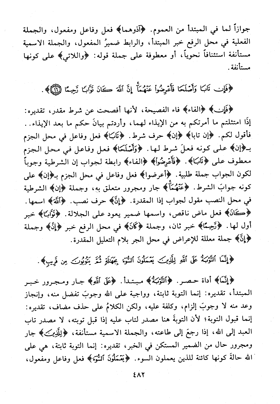 {فَإن} {الفاء} فاء الفصيحة، لأنها أفصحت عن شرط مقدر، تقديره: إذَا امتثلتم ما أمرتكم به من الإيذاء لهما، وأردتم بيانَ حكم ما بعد الإيذاء .. فأقول لكم. {إن تابا} {إن} حرف شرط. {تَابَا} فعل وفاعل في محل الجزم بـ {إن} على كونه فعلَ شرط لها. {وَأَصْلَحَا} فعل وفاعل في محل الجزم معطوف على {تَابَا}. {فَأَعْرِضُوا} {الفاء} رابطة لجواب إن الشرطية وجوبًا لكون الجواب جملة طلبية. {أعرضوا} فعل وفاعل في محل الجزم بـ {إن} على كونه جوابَ الشرط. {عَنْهُمَا} جار ومجرور متعلق به، وجملة {إن} الشرطية في محل النصب مقول لجواب إذا المقدرة. {إِنَّ} حرف نصب. {إِنَّ} اسمها. {كَانَ} فعل ماض ناقص، واسمها ضمير يعود على الجلالة. {تَوَّابًا} خبر أول لها. {رَحِيمًا} خبر ثان، وجملة {كَانَ} في محل الرفع خبر {إنَّ} وجملة {إِنَّ} جملة معللة للإعراض في محل الجر بلام التعليل المقدرة.
