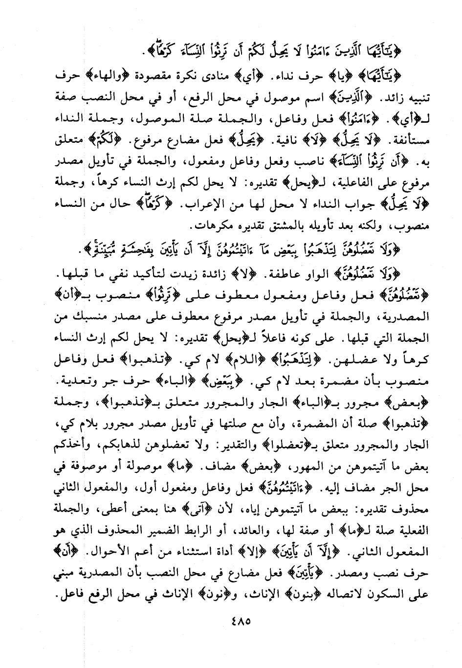 {يَا أَيُّهَا} {يا} حرف نداء. {أي} منادى نكرة مقصودة {والهاء} حرف تنبيه زائد. {الَّذِينَ} اسم موصول في محل الرفع، أو في محل النصب صفة لـ {أي}. {آمَنُوا} فعل وفاعل، والجملة صلة الموصول، وجملة النداء مستأنفة. {لَا يَحِلُّ} {لَا} نافية. {يَحِلُّ} فعل مضارع مرفوع. {لَكُمْ} متعلق به. {أَنْ تَرِثُوا النِّسَاءَ} ناصب وفعل وفاعل ومفعول، والجملة في تأويل مصدر مرفوع على الفاعلية، لـ {يحل} تقديره: لا يحل لكم إرث النساء كرهًا، وجملة {لَا يَحِلُّ} جواب النداء لا محل لها من الإعراب. {كَرْهًا} حال من النساء منصوب، ولكنه بعد تأويله بالمشتق تقديره مكرهات.