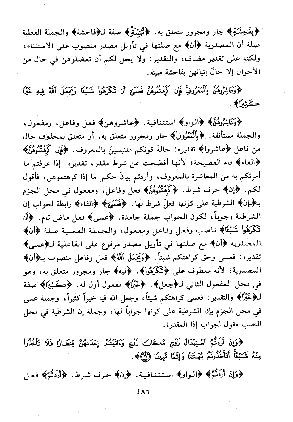 {وَعَاشِرُوهُنَّ} {الواو} استئنافية. {عاشروهن} فعل وفاعل، ومفعول، والجملة مستأنفة. {بِالْمَعْرُوفِ} جار ومجرور متعلق به، أو متعلق بمحذوف حال من فاعل {عاشروا} تقديره: حالةَ كونكم ملتبسينَ بالمعروف. {فَإِنْ كَرِهْتُمُوهُنَّ} {الفاء} فاء الفصيحة؛ لأنها أفصَحت عن شرط مقدر، تقديره: إذا عرفتم ما أمرتكم به من المعاشرة بالمعروف، وأردتم بيانَ حكمِ ما إذا كرهتموهن، فأقول لكم. {إن} حرف شرط. {كَرِهْتُمُوهُنَّ} فعل وفاعل، ومفعول في محل الجزم بـ {إن} الشرطية على كونها فعلَ شرط لها. {فَعَسَى} {الفاء} رابطة لجواب إن الشرطية وجوبًا، لكون الجواب جملة جامدة. {عسى} فعل ماض تام. {أَنْ تَكْرَهُوا شَيْئًا} ناصب وفعل وفاعل ومفعول، والجملة الفعلية صلة {أن} المصدرية {أن} مع صلتها في تأويل مصدر مرفوع على الفاعلية لـ {عسى} تقديره: فعسى وحق كراهتكم شيئًا. {وَيَجْعَلَ اللَّهُ} فعل وفاعل منصوب بـ {أن} المصدرية؛ لأنه معطوف على {تَكْرَهُوا}. {فيه} جار ومجرور متعلق به، وهو في محل المفعول الثاني لـ {جعل}. {خَيْرًا} مفعول أول له. {كَثِيرًا} صفة لـ {خَيْرًا} والتقدير: فعسى كراهتكم شيئًا، وجعل الله فيه خيرًا كثيرًا، وجملة عسى في محل الجزم بإن الشرطية على كونها جوابًا لها، وجملة إن الشرطية في محل النصب مقول لجواب إذا المقدرة.