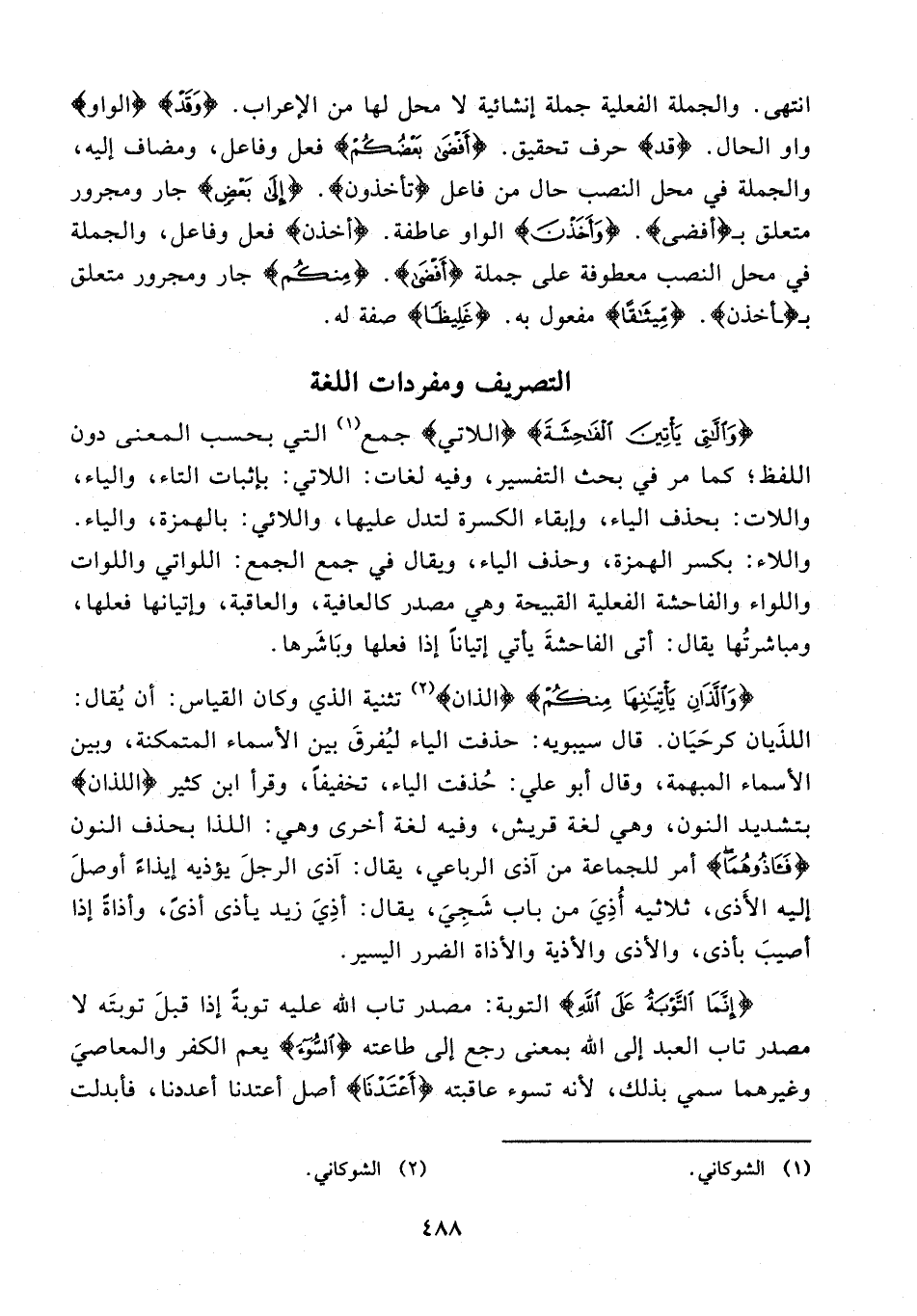 {وَاللَّذَانِ يَأتِيَانِهَا مِنْكُمْ} {الذان} (¬2) تثنية الذي وكان القياس: أن يُقال: اللذَيان كرحَيَان. قال سيبويه: حذفت الياء ليُفرقَ بين الأسماء المتمكنة، وبين الأسماء المبهمة، وقال أبو علي: حُذفت الياء، تخفيفًا، وقرأ ابن كثير {اللذان} بتشديد النون، وهي لغة قريش، وفيه لغة أخرى وهي: اللذا بحذف النون {فَآذُوهُمَا} أمر للجماعة من آذى الرباعي، يقال: آذى الرجلَ يؤذيه إيذاءَ أوصلَ إليه الأَذى، ثلاثيه أُذِيَ من باب شَجِيَ، يقال: أذِيَ زيد يأذى أذىً، وأذاةً إذا أصيبَ بأذى، والأذى والأذية والأذاة الضرر اليسير.
