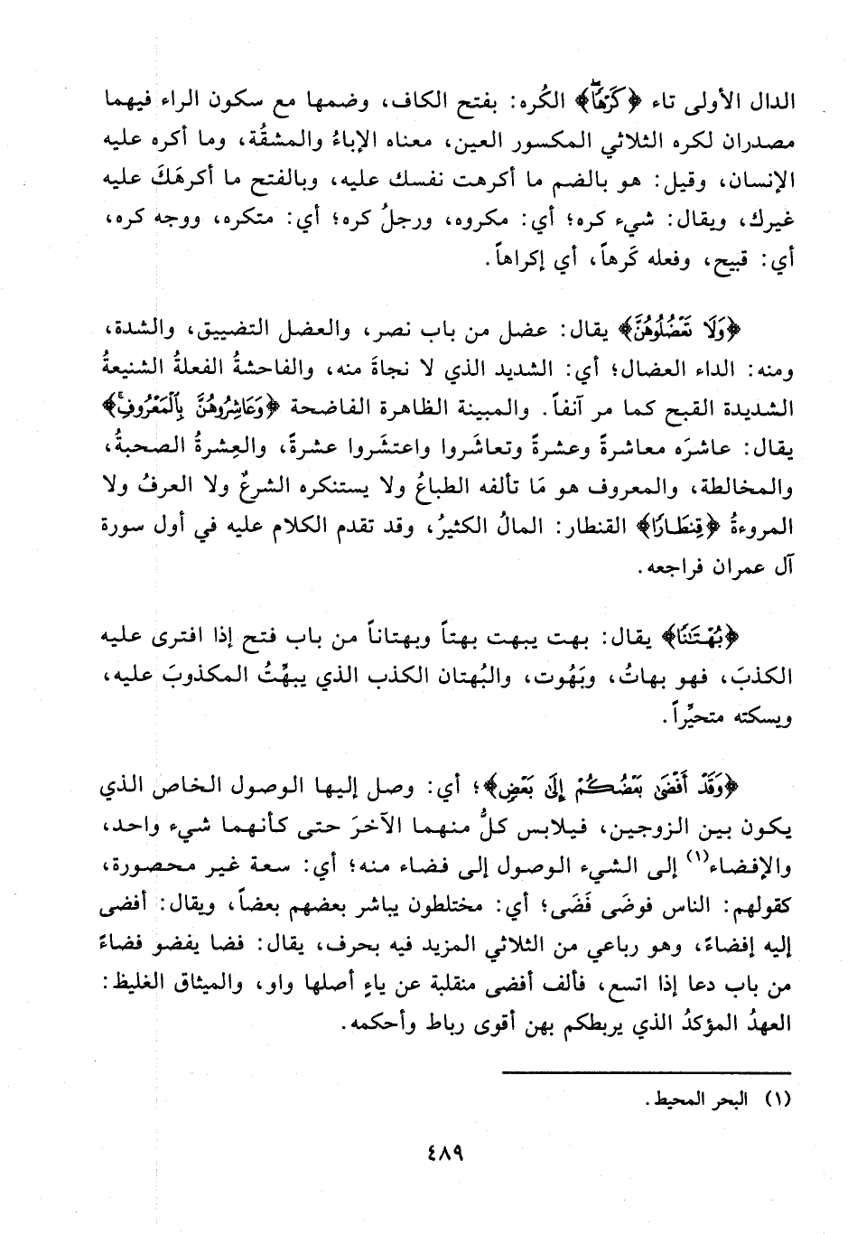 {وَلَا تَعْضُلُوهُنَّ} يقال: عضل من باب نصر، والعضل التضييق، والشدة، ومنه: الداء العضال؛ أي: الشديد الذي لا نجاةَ منه، والفاحشةُ الفعلةُ الشنيعةُ الشديدة القبح كما مر آنفًا. والمبينة الظاهرة الفاضحة {وَعَاشِرُوهُنَّ بِالْمَعْرُوفِ} يقال: عاشرَه معاشرةً وعشرةً وتعاشَروا واعتشَروا عشرةً، والعِشرةُ الصحبةُ، والمخالطة، والمعروف هو مَا تألفه الطباعُ ولا يستنكره الشرعٌ ولا العرفُ ولا المروءةُ {قِنْطَارًا} القنطار: المالُ الكثيرُ، وقد تقدم الكلام عليه في أول سورة آل عمران فراجعه.
