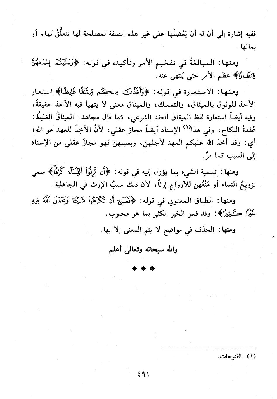 ومنها: تسمية الشيء بما يؤول إليه في قوله: {أَنْ تَرِثُوا النِّسَاءَ كَرْهًا} سمي تزويجُ النساء أو مَنْعُهن للأزواج إرثًا، لأن ذلكَ سببُ الإرث في الجاهلية.