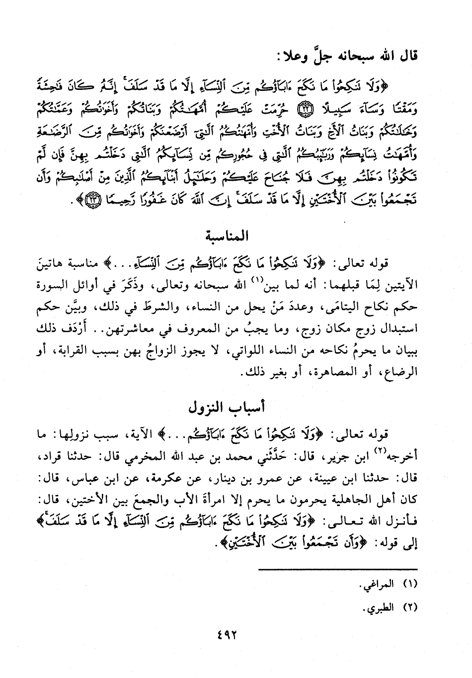 قوله تعالى: {وَلَا تَنْكِحُوا مَا نَكَحَ آبَاؤُكُمْ ...} الآية، سبب نزولِها: ما أخرجه (¬2) ابن جرير، قال: حَدَّثَني محمَّد بن عبد الله المخرمي قال: حدثنا قراد، قال: حدثنا ابن عيينة، عن عمرو بن دينار، عن عكرمة، عن ابن عباس، قال: كان أهل الجاهلية يحرمون ما يحرم إلا امرأةَ الأب والجمعَ بين الأختين، قال: فأنزل الله تعالى: {وَلَا تَنْكِحُوا مَا نَكَحَ آبَاؤُكُمْ مِنَ النِّسَاءِ إِلَّا مَا قَدْ سَلَفَ} إلى قوله: {وَأَنْ تَجْمَعُوا بَيْنَ الْأُخْتَيْنِ}.
