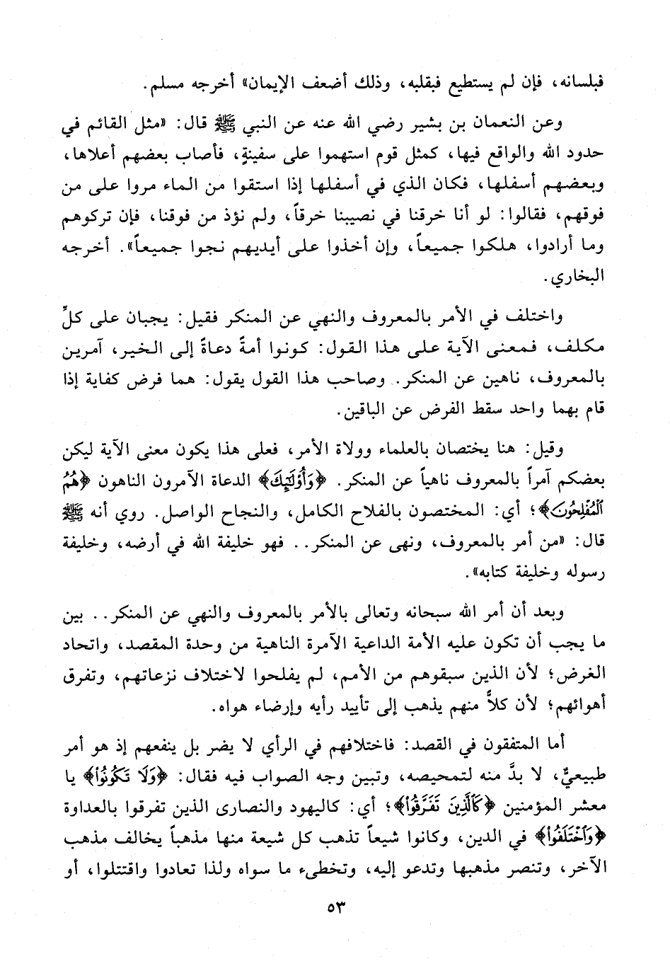 واختلف في الأمر بالمعروف والنهي عن المنكر فقيل: يجبان على كلِّ مكلف، فمعنى الآية على هذا القول: كونوا أمةً دعاةً إلى الخير، آمرين بالمعروف، ناهين عن المنكر. وصاحب هذا القول يقول: هما فرض كفاية إذا قام بهما واحد سقط الفرض عن الباقين.