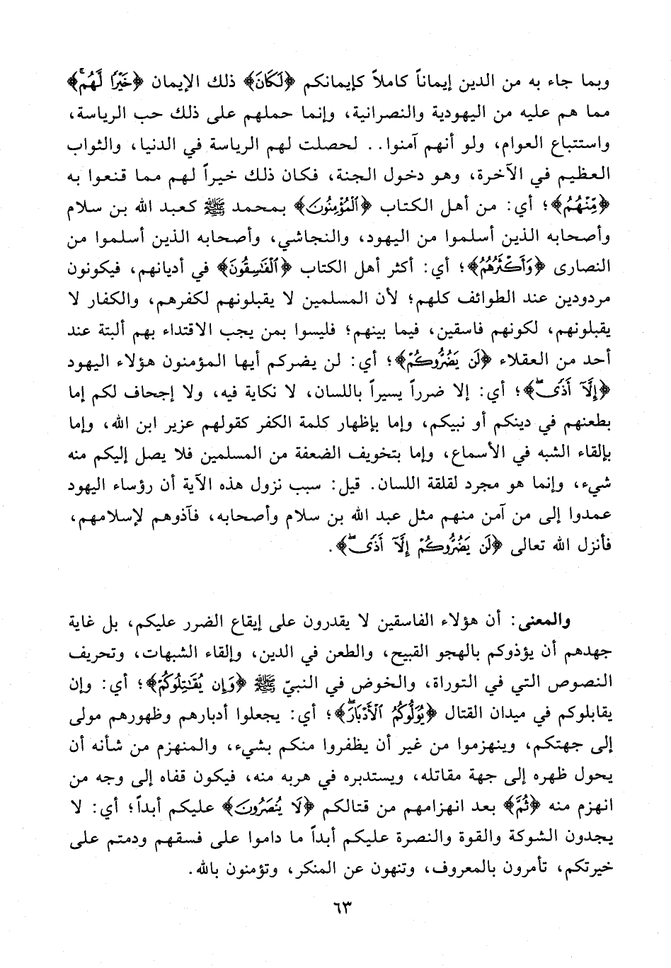 111 - {لَنْ يَضُرُّوكُمْ}؛ أي: لن يضركم أيها المؤمنون هؤلاء اليهود {إِلَّا أَذًى}؛ أي: إلا ضررًا يسيرًا باللسان، لا نكاية فيه، ولا إجحاف لكم إما بطعنهم في دينكم أو نبيكم، وإما بإظهار كلمة الكفر كقولهم عزير ابن الله، وإما بإلقاء الشبه في الأسماع، وإما بتخويف الضعفة من المسلمين فلا يصل إليكم منه شيء، وإنما هو مجرد لقلقة اللسان. قيل: سبب نزول هذه الآية أن رؤساء اليهود عمدوا إلى من آمن منهم مثل عبد الله بن سلام وأصحابه، فآذوهم لإسلامهم، فأنزل الله تعالى {لَنْ يَضُرُّوكُمْ إِلَّا أَذًى}.