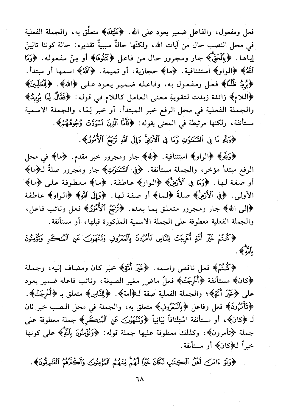 فعل ومفعول، والفاعل ضمير يعود على الله. {عَلَيْكَ} متعلِّق به، والجملة الفعلية في محل النصب حال من آيات الله، ولكنها حالةٌ سببيةٌ تقديره: حالة كوننا تالِينَ إياها. {بِالْحَقِّ} جار ومجرور حال من فاعل {نَتْلُوهَا} أو مِنْ مفعوله. {وَمَا اللَّهُ} {الواو} استئنافية. {ما} حجازية، أو تميمة. {اللَّهُ} اسمها أو مبتدأ. {يُرِيدُ ظُلْمًا} فعل ومفعول به، وفاعله ضمير يعود على {الله}. {لِلْعَالَمِينَ} {اللام} زائدة زيدت لتقويةِ معنى العامل كاللام في قوله: {فَعَّالٌ لِمَا يُرِيدُ} والجملة الفعلية في محل الرفع خبر المبتدأ، أو خبر لِمَا، والجملة الإسمية مستأنفة، ولكنها مرتبطة في المعنى بقوله: {فَأَمَّا الَّذِينَ اسْوَدَّتْ وُجُوهُهُمْ}.