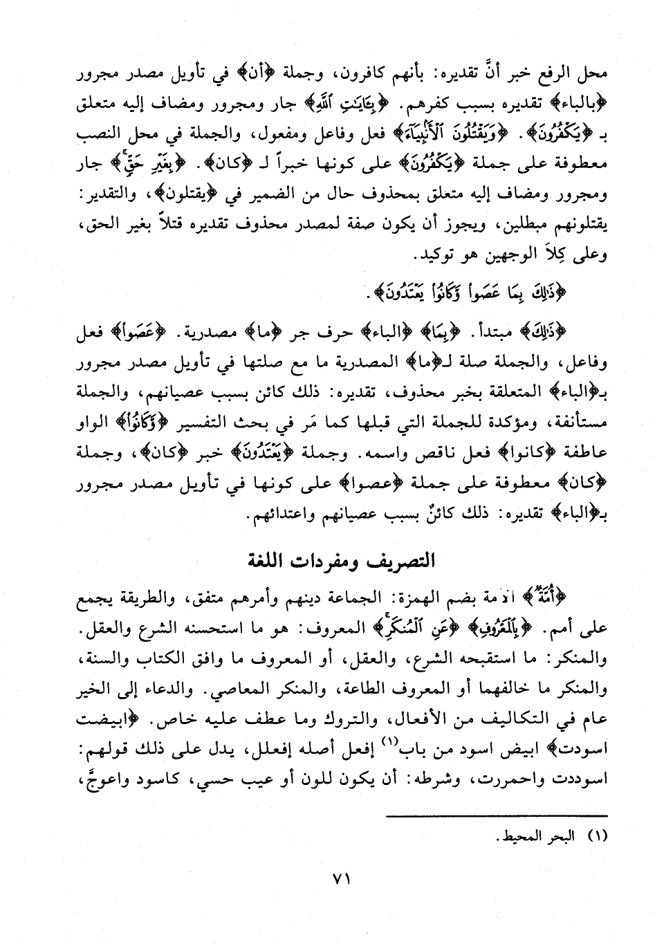 {أُمَّةٍ} الأُمة بضم الهمزة: الجماعة دينهم وأمرهم متفق، والطريقة يجمع على أمم. {بِالْمَعْرُوفِ} {عَنِ الْمُنْكَرِ} المعروف: هو ما استحسنه الشرع والعقل. والمنكر: ما استقبحه الشرع، والعقل، أو المعروف ما وافق الكتاب والسنة، والمنكر ما خالفهما أو المعروف الطاعة، والمنكر المعاصي. والدعاء إلى الخير عام في التكاليف من الأفعال، والتروك وما عطف عليه خاص. {ابيضت اسودت} ابيض اسود من باب (¬1) إفعل أصله إفعلل، يدل على ذلك قولهم: اسوددت واحمررت، وشرطه: أن يكون للون أو عيب حسي، كاسود واعوجَّ،