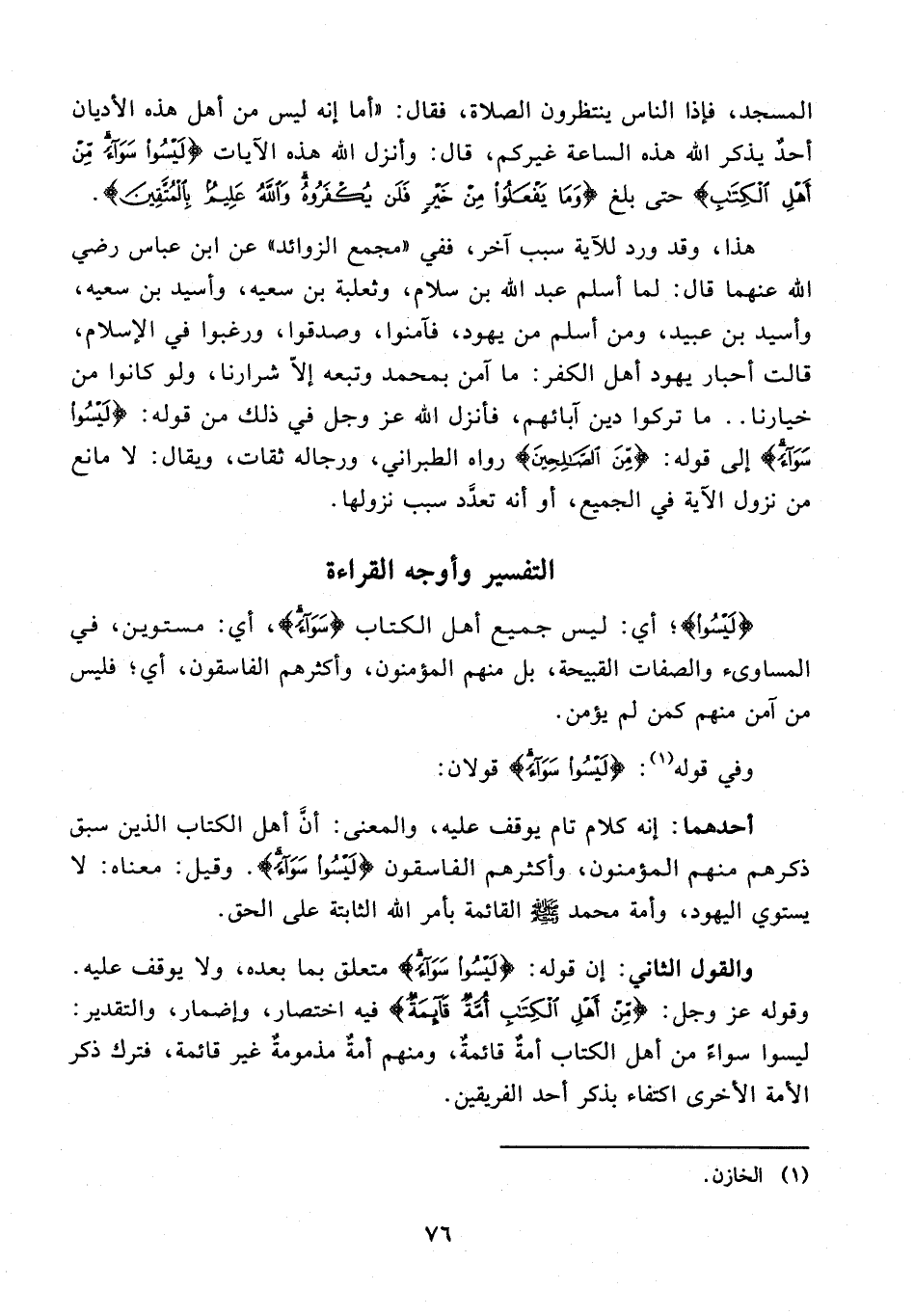 والقول الثاني: إن قوله: {لَيْسُوا سَوَاءً} متعلق بما بعده، ولا يوقف عليه. وقوله عَزَّ وَجَلَّ: {مِنْ أَهْلِ الْكِتَابِ أُمَّةٌ قَائِمَةٌ} فيه اختصار، وإضمار، والتقدير: ليسوا سواءً من أهل الكتاب أمةٌ قائمةٌ، ومنهم أمةٌ مذمومةٌ غير قائمة، فترك ذكر الأمة الأخرى اكتفاء بذكر أحد الفريقين.