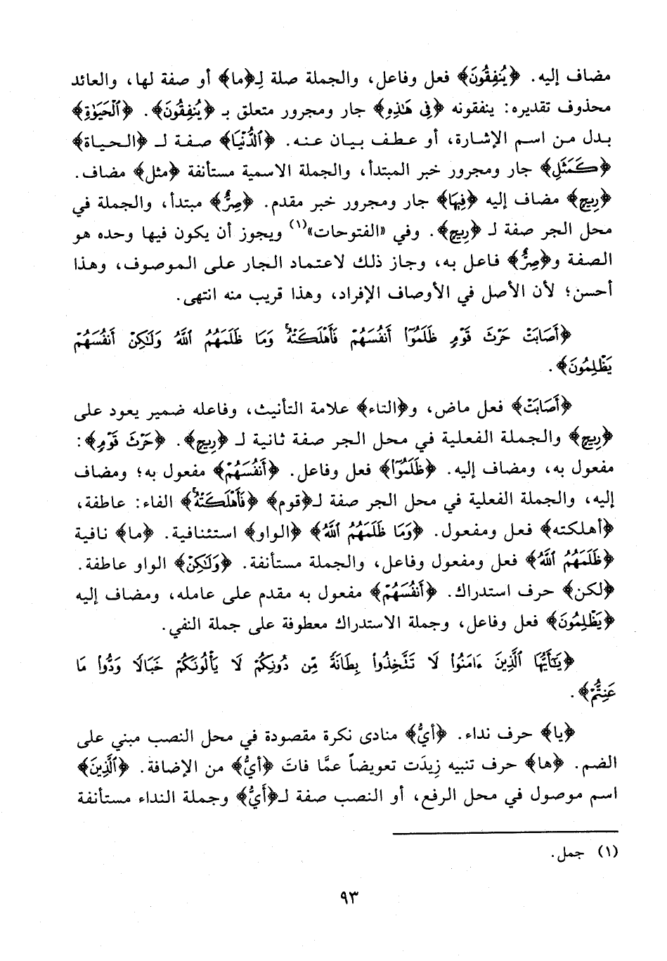 مضاف إليه. {يُنْفِقُونَ} فعل وفاعل، والجملة صلة لِـ {ما} أو صفة لها، والعائد محذوف تقديره: ينفقونه {فِي هَذِهِ} جار ومجرور متعلق بـ {يُنْفِقُونَ}. {الْحَيَاةِ} بدل من اسم الإشارة، أو عطف بيان عنه. {الدُّنْيَا} صفة لـ {الْحَيَاةِ} {كَمَثَلِ} جار ومجرور خبر المبتدأ، والجملة الإسمية مستأنفة {مثل} مضاف. {رِيحٍ} مضاف إليه {فِيهَا} جار ومجرور خبر مقدم. {صِرٌّ} مبتدأ، والجملة في محل الجر صفة لـ {رِيحٍ}. وفي "الفتوحات" (¬1) ويجوز أن يكون فيها وحده هو الصفة و {صِرٌّ} فاعل به، وجاز ذلك لاعتماد الجار على الموصوف، وهذا أحسن؛ لأن الأصل في الأوصاف الإفراد، وهذا قريب منه انتهى.