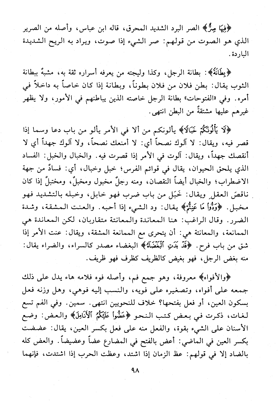 {لَا يَأْلُونَكُمْ خَبَالًا} يألونكم من ألا في الأمر يألو من باب دعا وسما إذا قصر فيه، ويقال: لا آلوك نصحًا أي: لا أمنعك نصحًا، ولا آلوك جهدًا أي لا أنقصك جهدًا، ويقال: آلوت في الأمر إذا قصرت فيه. والخبال والخبل: الفساد الذي يلحق الحيوان، يقال في قوائم الفرس؛ خبل وخبال، أي: فسادٌ من جهة الاضطراب؛ والخبال أيضًا النقصان، ومنه رجلٌ مخبول ومخبلٌ، ومختبلٌ إذا كان ناقصَ العقلِ ويقال: خَبَل من باب ضرب فهو خابل، وخبله بالتشديد فهو مخبل. {وَدُّوا مَا عَنِتُّمْ} يقال: ود الشيء إذا أحبه. والعنت المشقة، وشدة الضرر. وقال الراغب: هنا المعاندة والمعانتة متقاربان، لكن المعاندة هي الممانعة، والمعانتة هي: أن يتحرى مع الممانعة المشقة، ويقال: عنت الأمر إذا شق من باب فرح. {قَدْ بَدَتِ الْبَغْضَاءُ} البغضاء مصدر كالسراء، والضراء يقال: منه بغض الرجل، فهو بغيض كالظريف كظرف فهو ظريف.