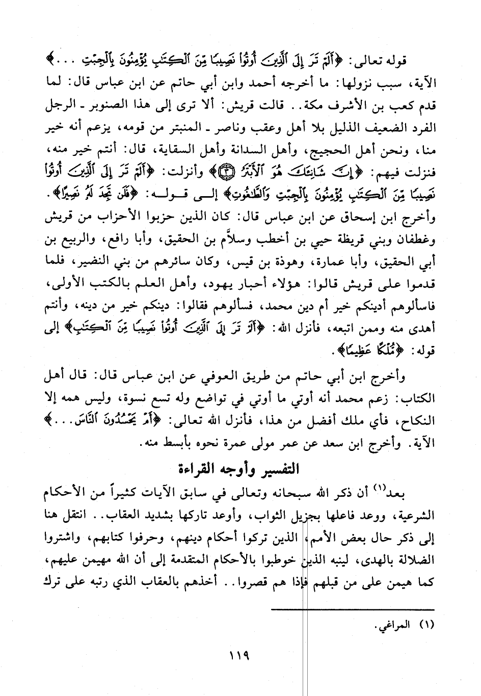 قوله تعالى: {أَلَمْ تَرَ إِلَى الَّذِينَ أُوتُوا نَصِيبًا مِنَ الْكِتَابِ يُؤْمِنُونَ بِالْجِبْتِ ...} الآية، سبب نزولها: ما أخرجه أحمد وابن أبي حاتم عن ابن عباس قال: لما قدم كعب بن الأشرف مكة .. قالت قريش: ألا ترى إلى هذا الصنوبر - الرجل الفرد الضعيف الذليل بلا أهل وعقب وناصر - المنبتر من قومه، يزعم أنه خير منا، ونحن أهل الحجيج، وأهل السدانة وأهل السقاية، قال: أنتم خير منه، فنزلت فيهم: {إِنَّ شَانِئَكَ هُوَ الْأَبْتَرُ (3)} وأنزلت: {أَلَمْ تَرَ إِلَى الَّذِينَ أُوتُوا نَصِيبًا مِنَ الْكِتَابِ يُؤْمِنُونَ بِالْجِبْتِ وَالطَّاغُوتِ} إلى قوله: {فَلَنْ تَجِدَ لَهُ نَصِيرًا}. وأخرج ابن إسحاق عن ابن عباس قال: كان الذين حزبوا الأحزاب من قريش وغطفان وبني قريظة حيي بن أخطب وسلَّام بن الحقيق، وأبا رافع، والربيع بن أبي الحقيق، وأبا عمارة، وهوذة بن قيس، وكان سائرهم من بني النضير، فلما قدموا على قريش قالوا: هؤلاء أحبار يهود، وأهل العلم بالكتب الأولى، فاسألوهم أدينكم خير أم دين محمَّد، فسألوهم فقالوا: دينكم خير من دينه، وأنتم أهدى منه وممن اتبعه، فأنزل الله: {أَلَمْ تَرَ إِلَى الَّذِينَ أُوتُوا نَصِيبًا مِنَ الْكِتَابِ} إلى قوله: {مُلْكًا عَظِيمًا}.