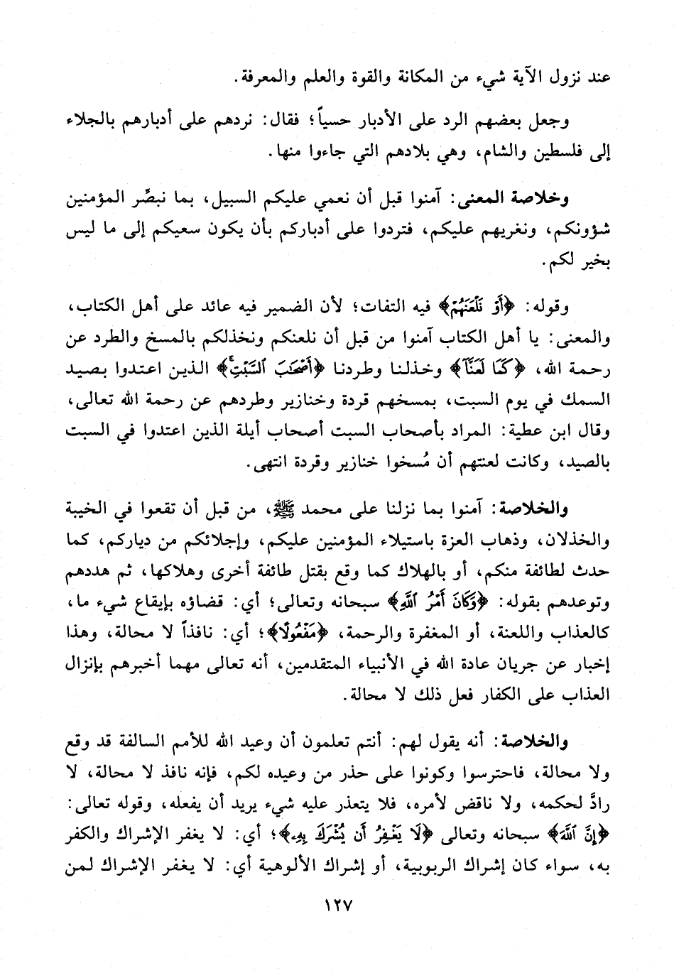 وقوله: {أَوْ نَلْعَنَهُمْ} فيه التفات؛ لأن الضمير فيه عائد على أهل الكتاب، والمعنى: يا أهل الكتاب آمنوا من قبل أن نلعنكم ونخذلكم بالمسخ والطرد عن رحمة الله، {كَمَا لَعَنَّا} وخذلنا وطردنا {أَصْحَابَ السَّبْتِ} الذين اعتدوا بصيد السمك في يوم السبت، بمسخهم قردة وخنازير وطردهم عن رحمة الله تعالى، وقال ابن عطية: المراد بأصحاب السبت أصحاب أيلة الذين اعتدوا في السبت بالصيد، وكانت لعنتهم أن مُسخوا خنازير وقردة انتهى.