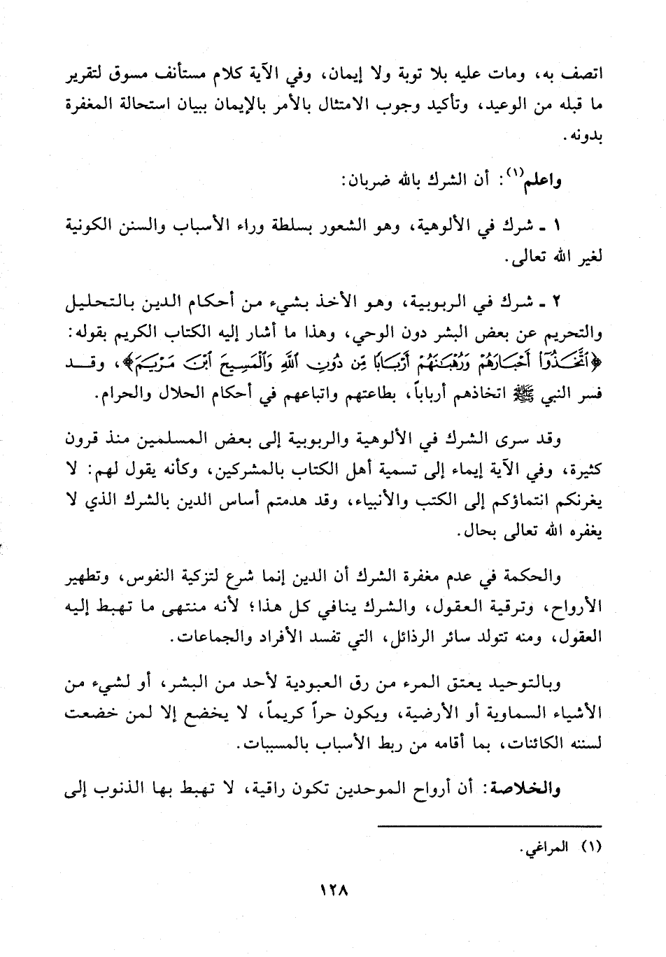 وقد سرى الشرك في الألوهية والربوبية إلى بعض المسلمين منذ قرون كثيرة، وفي الآية إيماء إلى تسمية أهل الكتاب بالمشركين، وكأنه يقول لهم: لا يغرنكم انتماؤكم إلى الكتب والأنبياء، وقد هدمتم أساس الدين بالشرك الذي لا يغفره الله تعالى بحال.