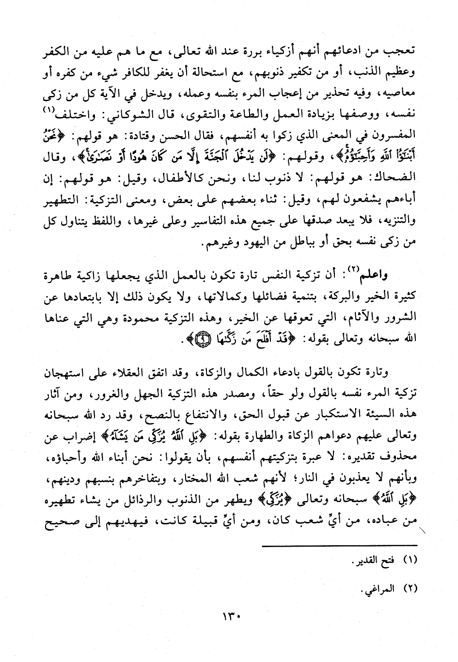 وتارة تكون بالقول بادعاء الكمال والزكاة، وقد اتفق العقلاء على استهجان تزكية المرء نفسه بالقول ولو حقًّا، ومصدر هذه التزكية الجهل والغرور، ومن آثار هذه السيئة الاستكبار عن قبول الحق، والانتفاع بالنصح، وقد رد الله سبحانه وتعالى عليهم دعواهم الزكاة والطهارة بقوله: {بَلِ اللَّهُ يُزَكِّي مَنْ يَشَاءُ} إضراب عن محذوف تقديره: لا عبرة بتزكيتهم أنفسهم، بأن يقولوا: نحن أبناء الله وأحباؤه، وبأنهم لا يعذبون في النار؛ لأنهم شعب الله المختار، وبتفاخرهم بنسبهم ودينهم، {بَلِ اللَّهُ} سبحانه وتعالى {يُزَكِّي} ويطهر من الذنوب والرذائل من يشاء تطهيره من عباده، من أيِّ شعب كان، ومن أيِّ قبيلة كانت، فيهديهم إلى صحيح