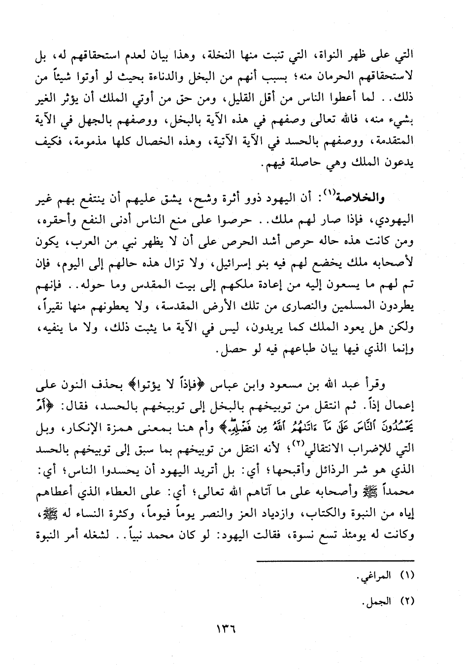 والخلاصة (¬1): أن اليهود ذوو أثرة وشح، يشق عليهم أن ينتفع بهم غير اليهودي، فإذا صار لهم ملك .. حرصوا على منع الناس أدنى النفع وأحقره، ومن كانت هذه حاله حرص أشد الحرص على أن لا يظهر نبي من العرب، يكون لأصحابه ملك يخضع لهم فيه بنو إسرائيل، ولا تزال هذه حالهم إلى اليوم، فإن تم لهم ما يسعون إليه من إعادة ملكهم إلى بيت المقدس وما حوله .. فإنهم يطردون المسلمين والنصارى من تلك الأرض المقدسة، ولا يعطونهم منها نقيرًا، ولكن هل يعود الملك كما يريدون، ليس في الآية ما يثبت ذلك، ولا ما ينفيه، وإنما الذي فيها بيان طباعهم فيه لو حصل.