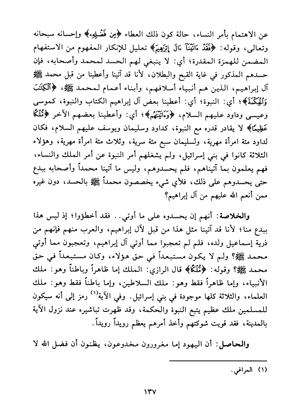 عن الاهتمام بأمر النساء، حالة كون ذلك العطاء {مِنْ فَضْلِهِ} وإحسانه سبحانه وتعالى، وقوله: {فَقَدْ آتَيْنَا آلَ إِبْرَاهِيمَ} تعليل للإنكار المفهوم من الاستفهام المضمن للهمزة المقدرة؛ أي لا ينبغي لهم الحسد لمحمد وأصحابه، فإن حسدهم المذكور في غاية القبح والبطلان؛ لأنا قد آتينا وأعطينا من قبل محمَّد - صلى الله عليه وسلم - آل إبراهيم، الذين هم أنبياء أسلافهم، وأبناء أعمام لمحمد - صلى الله عليه وسلم -، {الْكِتَابَ وَالْحِكْمَةَ}؛ أي: النبوة؛ أي: أعطينا بعض آل إبراهيم الكتاب والنبوة، كموسى وعيسى وداود عليهم السلام، {وَآتَيْنَاهُمْ}؛ أي: وأعطينا بعضهم الآخر {مُلْكًا عَظِيمًا} لا يقادر قدره مع النبوة، كداود وسليمان ويوسف عليهم السلام، فكان لداود مئة امرأة مهرية، ولسليمان سبع مئة سرية، وثلاث مئة امرأة مهرية، وهؤلاء الثلاثة كانوا في بني إسرائيل، ولم يشغلهم أمر النبوة عن أمر الملك والنساء، فهم يعلمون بما آتيناهم، فلم يحسدوهم، وليس ما آتينا محمدًا وأصحابه ببدع حتى يحسدوهم على ذلك، فلأي شيء يخصصون محمدًا - صلى الله عليه وسلم - بالحسد، دون غيره ممن أنعم الله عليهم من آل إبراهيم؟