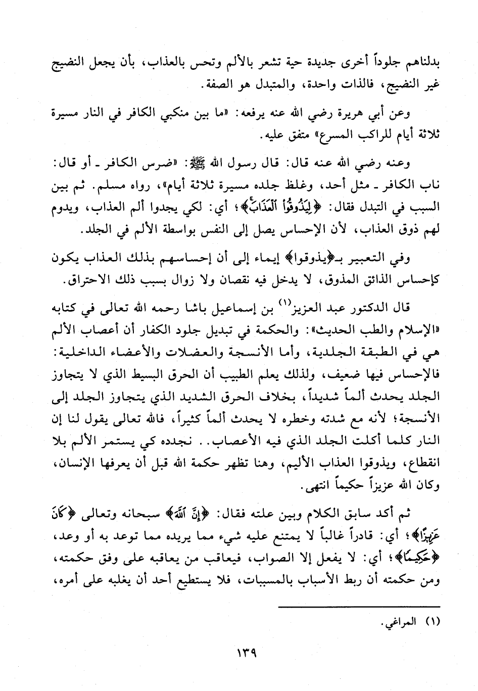 قال الدكتور عبد العزيز (¬1) بن إسماعيل باشا رحمه الله تعالى في كتابه "الإِسلام والطب الحديث": والحكمة في تبديل جلود الكفار أن أعصاب الألم هي في الطبقة الجلدية، وأما الأنسجة والعضلات والأعضاء الداخلية: فالإحساس فيها ضعيف، ولذلك يعلم الطبيب أن الحرق البسيط الذي لا يتجاوز الجلد يحدث ألمًا شديدًا، بخلاف الحرق الشديد الذي يتجاوز الجلد إلى الأنسجة؛ لأنه مع شدته وخطره لا يحدث ألمًا كثيرًا، فالله تعالى يقول لنا إن النار كلما أكلت الجلد الذي فيه الأعصاب .. نجدده كي يستمر الألم بلا انقطاع، ويذوقوا العذاب الأليم، وهنا تظهر حكمة الله قبل أن يعرفها الإنسان، وكان الله عزيزًا حكيمًا انتهى.