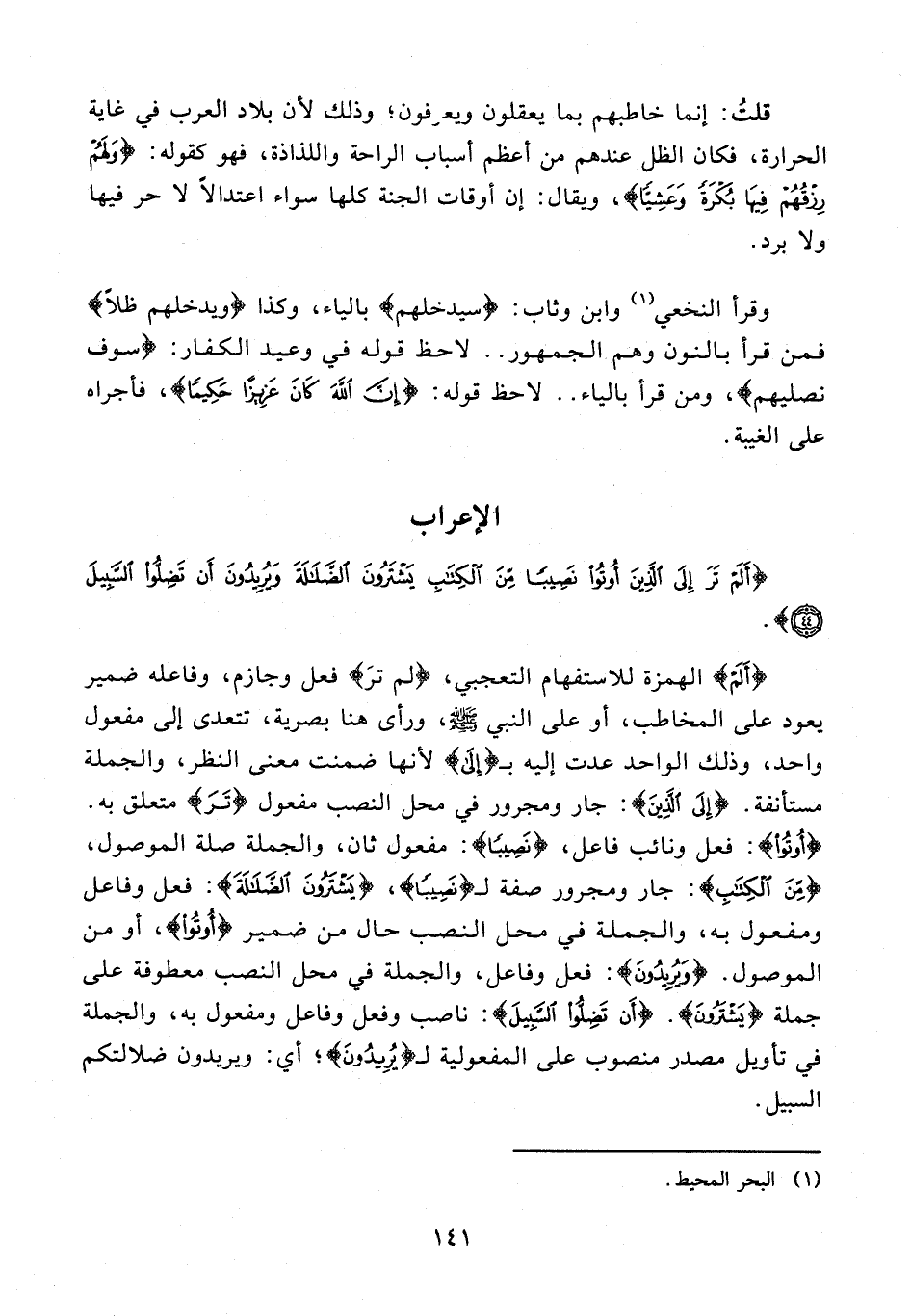 {أَلَمْ} الهمزة للاستفهام التعجبي، {لم ترَ} فعل وجازم، وفاعله ضمير يعود على المخاطب، أو على النبي - صلى الله عليه وسلم -، ورأى هنا بصرية، تتعدى إلى مفعول واحد، وذلك الواحد عدت إليه بـ {إِلَى} لأنها ضمنت معنى النظر، والجملة مستأنفة. {إِلَى الَّذِينَ}: جار ومجرور في محل النصب مفعول {تَرَ} متعلق به. {أُوتُوا}: فعل ونائب فاعل، {نَصِيبًا}: مفعول ثان، والجملة صلة الموصول، {مِنَ الْكِتَابِ}: جار ومجرور صفة لـ {نَصِيبًا}، {يَشْتَرُونَ الضَّلَالَةَ}: فعل وفاعل ومفعول به، والجملة في محل النصب حال من ضمير {أُوتُوا}، أو من الموصول. {وَيُرِيدُونَ}؛ فعل وفاعل، والجملة في محل النصب معطوفة على جملة {يَشْتَرُونَ}. {أَنْ تَضِلُّوا السَّبِيلَ}: ناصب وفعل وفاعل ومفعول به، والجملة في تأويل مصدر منصوب على المفعولية لـ {يُرِيدُونَ}؛ أي: ويريدون ضلالتكم السبيل.