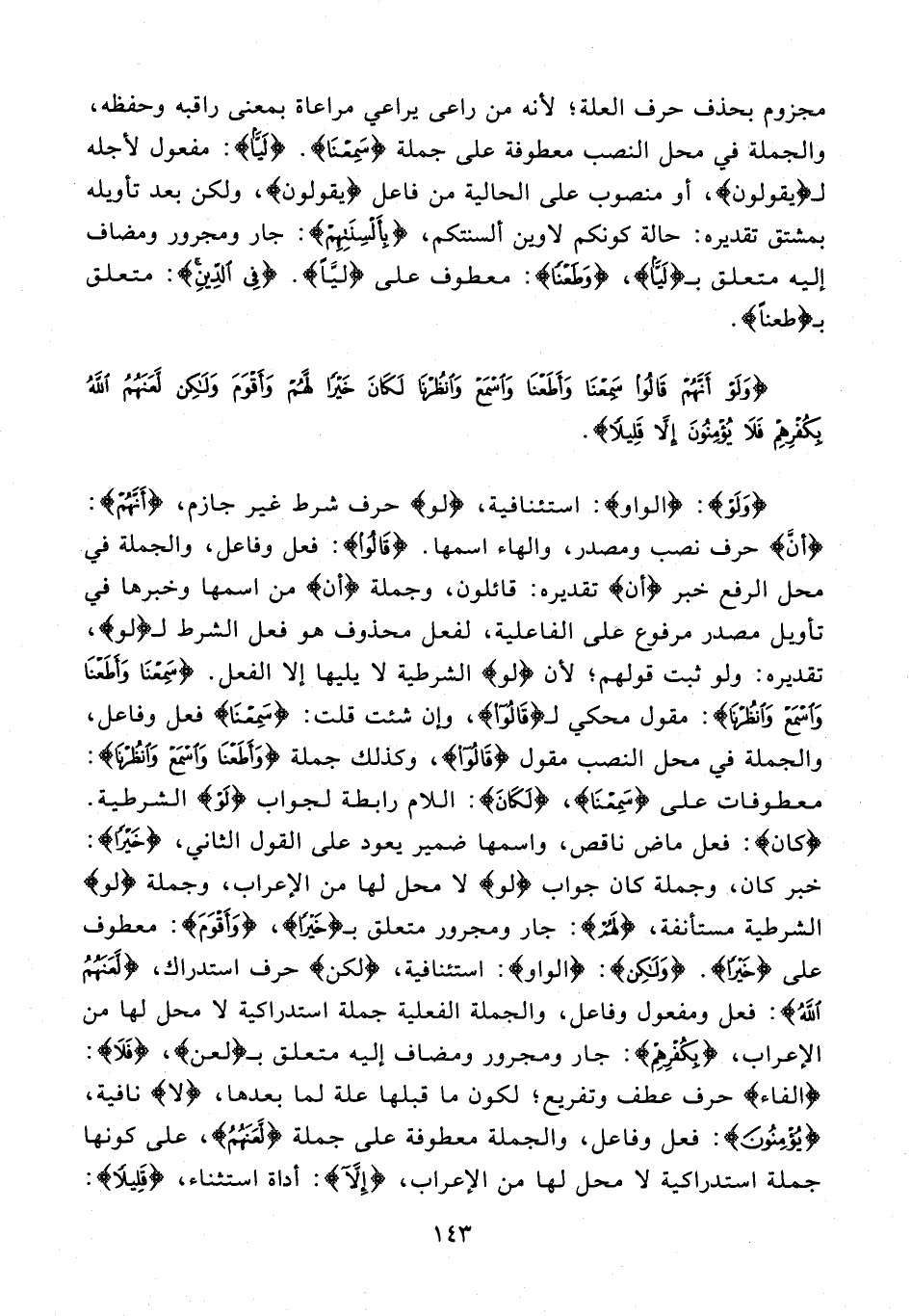 {وَلَوْ}: {الواو}: استئنافية، {لو} حرف شرط غير جازم، {أَنَّهُمْ}: {أنَّ} حرف نصب ومصدر، والهاء اسمها. {قَالُوا}: فعل وفاعل، والجملة في محل الرفع خبر {أن} تقديره: قائلون، وجملة {أن} من اسمها وخبرها في تأويل مصدر مرفوع على الفاعلية، لفعل محذوف هو فعل الشرط لـ {لو}، تقديره: ولو ثبت قولهم؛ لأن {لو} الشرطية لا يليها إلا الفعل. {سَمِعْنَا وَأَطَعْنَا وَاسْمَعْ وَانْظُرْنَا}: مقول محكي لـ {قَالُوا}، وإن شئت قلت: {سَمِعْنَا} فعل وفاعل، والجملة في محل النصب مقول {قَالُوا}، وكذلك جملة {وَأَطَعْنَا وَاسْمَعْ وَانْظُرْنَا}: معطوفات على {سَمِعْنَا}، {لَكَانَ}: اللام رابطة لجواب {لَوْ} الشرطية. {كان}: فعل ماض ناقص، واسمها ضمير يعود على القول الثاني، {خَيْرًا}: خبر كان، وجملة كان جواب {لو} لا محل لها من الإعراب، وجملة {لو} الشرطية مستأنفة، {لَهُمْ}: جار ومجرور متعلق بـ {خَيْرًا}، {وَأَقْوَمَ}: معطوف على {خَيْرًا}. {وَلَكِنْ}: {الواو}: استئنافية، {لكن} حرف استدراك، {لَعَنَهُمُ اللَّهُ}: فعل ومفعول وفاعل، والجملة الفعلية جملة استدراكية لا محل لها من الإعراب، {بِكُفْرِهِمْ}: جار ومجرور ومضاف إليه متعلق بـ {لعن}، {فَلَا}: {الفاء} حرف عطف وتفريع؛ لكون ما قبلها علة لما بعدها، {لا} نافية، {يُؤْمِنُونَ}: فعل وفاعل، والجملة معطوفة على جملة {لَعَنَهُمُ}، على كونها جملة استدراكية لا محل لها من الإعراب، {إِلَّا}: أداة استثناء، {قَلِيلًا}: