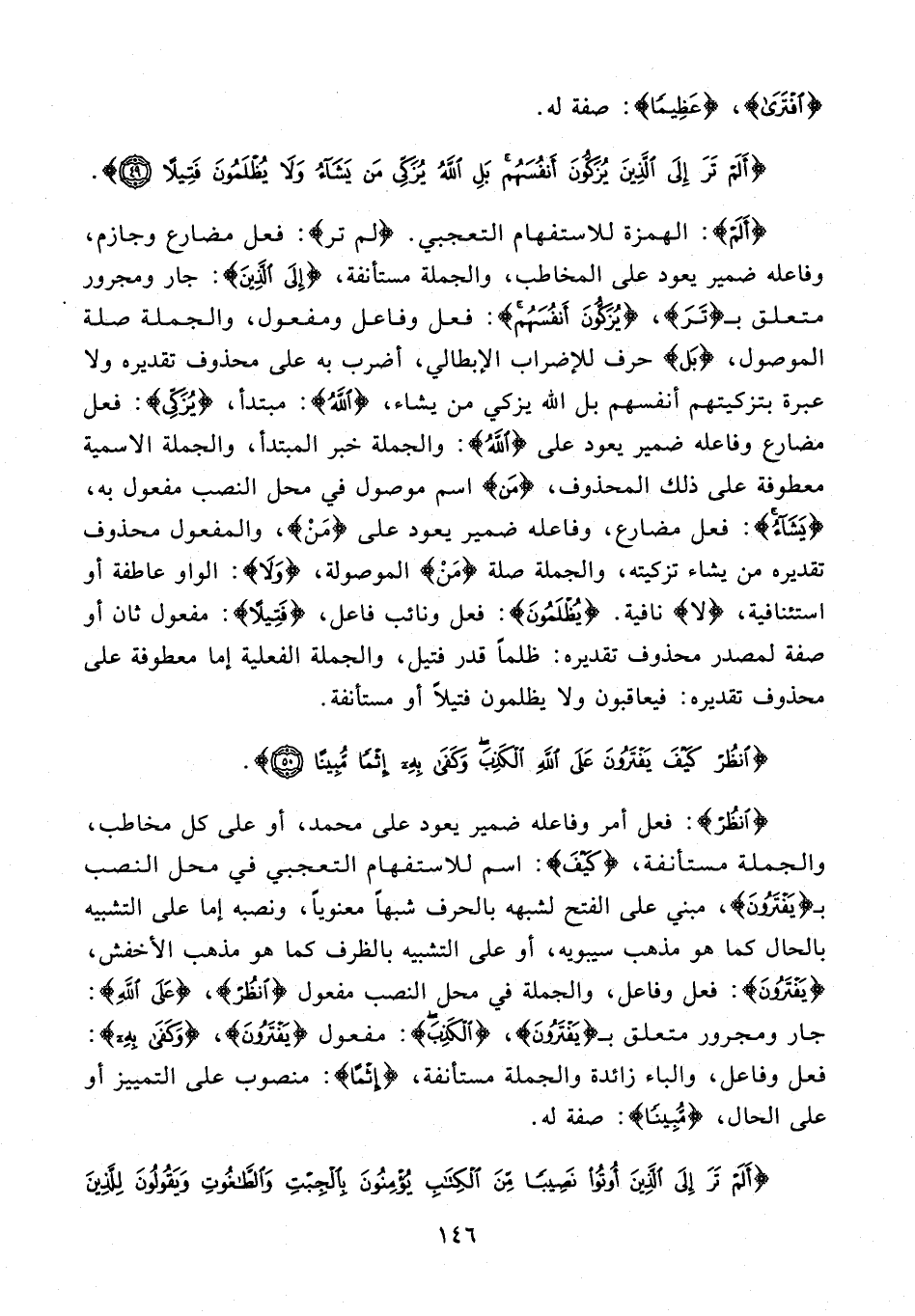 {أَلَمْ}: الهمزة للاستفهام التعجبي. {لم تر}: فعل مضارع وجازم، وفاعله ضمير يعود على المخاطب، والجملة مستأنفة، {إِلَى الَّذِينَ}: جار ومجرور متعلق بـ {تَرَ}، {يُزَكُّونَ أَنْفُسَهُمْ}: فعل وفاعل ومفعول، والجملة صلة الموصول، {بَلِ} حرف للإضراب الإبطالي، أضرب به على محذوف تقديره ولا عبرة بتزكيتهم أنفسهم بل الله يزكي من يشاء، {اللَّهُ}: مبتدأ، {يُزَكِّي}: فعل مضارع وفاعله ضمير يعود على {اللَّهُ}: والجملة خبر المبتدأ، والجملة الإسمية معطوفة على ذلك المحذوف، {مَنْ} اسم موصول في محل النصب مفعول به، {يَشَاءُ}: فعل مضارع، وفاعله ضمير يعود على {مَنْ}، والمفعول محذوف تقديره من يشاء تزكيته، والجملة صلة {مَنْ} الموصولة، {وَلَا}: الواو عاطفة أو استئنافية، {لا} نافية. {يُظْلَمُونَ}: فعل ونائب فاعل، {فَتِيلًا}: مفعول ثان أو صفة لمصدر محذوف تقديره: ظلمًا قدر فتيل، والجملة الفعلية إما معطوفة على محذوف تقديره: فيعاقبون ولا يظلمون فتيلًا أو مستأنفة.
