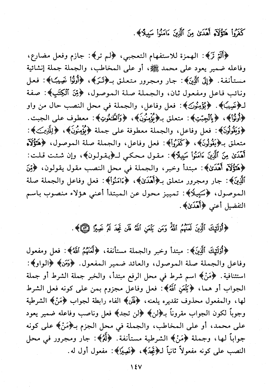 {أَلَمْ تَرَ}: الهمزة للاستفهام التعجبي، {لم تر}: جازم وفعل مضارع، وفاعله ضمير يعود على محمَّد - صلى الله عليه وسلم -، أو على المخاطب، والجملة جملة إنشائية مستأنفة. {إِلَى الَّذِينَ}: جار ومجرور متعلق بـ {تَرَ}، {أُوتُوا نَصِيبًا}: فعل ونائب فاعل ومفعول ثان، والجملة صلة الموصول، {مِنَ الْكِتَابِ}: صفة لـ {نَصِيبًا}. {يُؤْمِنُونَ}: فعل وفاعل، والجملة في محل النصب حال من واو {أُوتُوا}، {بِالْجِبْتِ}: متعلق بـ {يُؤْمِنُونَ}، {وَالطَّاغُوتِ}: معطوف على الجبت. {وَيَقُولُونَ}: فعل وفاعل، والجملة معطوفة على جملة {يُؤْمِنُونَ}، {لِلَّذِينَ}: متعلق بـ {يَقُولُونَ}، {كَفَرُوا}: فعل وفاعل، والجملة صلة الموصول، {هَؤُلَاءِ أَهْدَى مِنَ الَّذِينَ آمَنُوا سَبِيلًا}: مقول محكي لـ {يقولون}، وإن شئت قلت: {هَؤُلَاءِ أَهْدَى}: مبتدأ وخبر، والجملة في محل النصب مقول يقولون، {مِنَ الَّذِينَ}: جار ومجرور متعلق بـ {أَهْدَى}، {آمَنُوا}: فعل وفاعل والجملة صلة الموصول، {سَبِيلًا}: تمييز محول عن المبتدأ أعني هؤلاء منصوب باسم التفضيل أعني {أَهْدَى}.