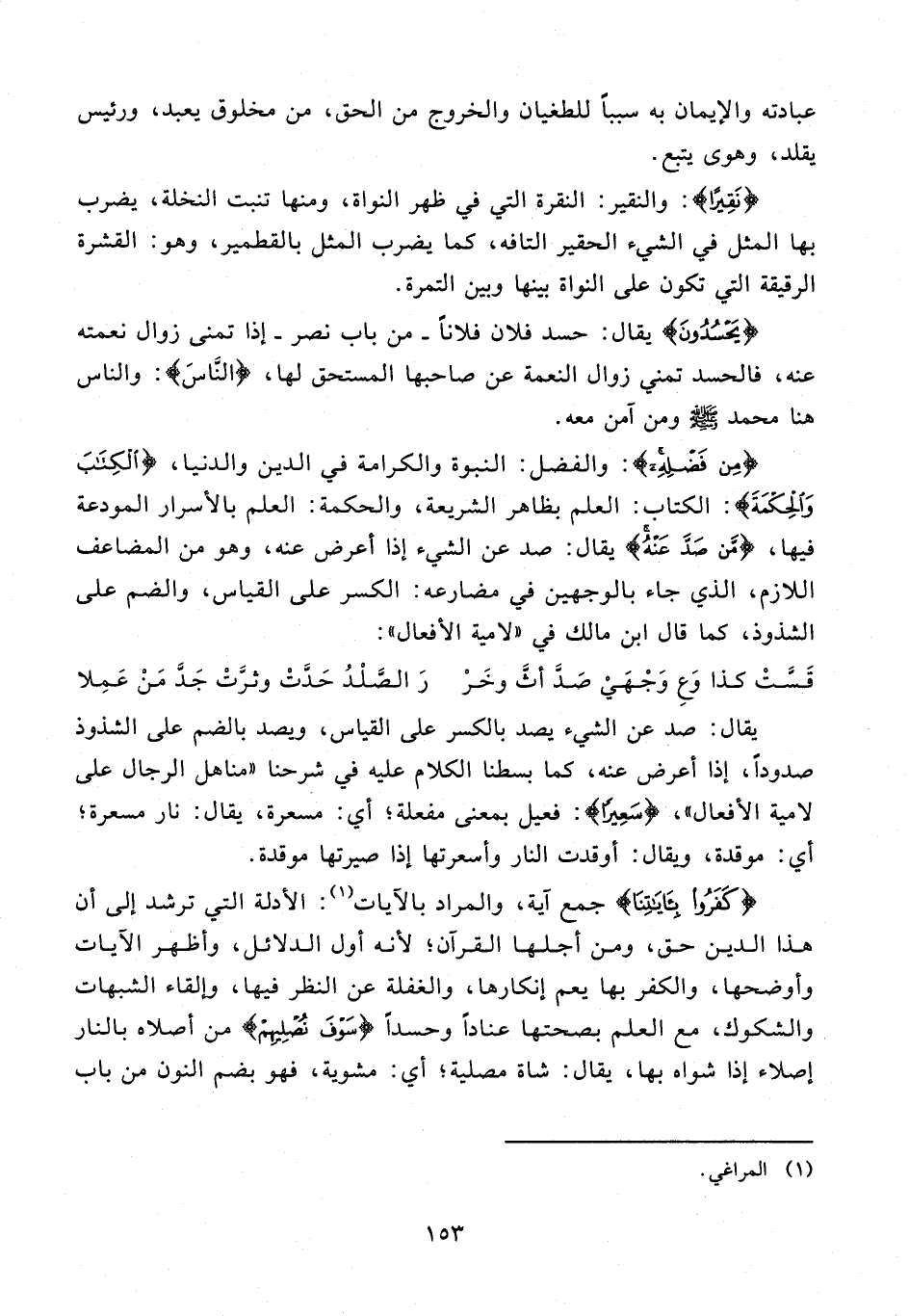 {مِنْ فَضْلِهِ}: والفضل: النبوة والكرامة في الدين والدنيا، {الْكِتَابَ وَالْحِكْمَةَ}: الكتاب: العلم بظاهر الشريعة، والحكمة: العلم بالأسرار المودعة فيها، {مَنْ صَدَّ عَنْهُ} يقال: صد عن الشيء إذا أعرض عنه، وهو من المضاعف اللازم، الذي جاء بالوجهين في مضارعه: الكسر على القياس، والضم على الشذوذ، كما قال ابن مالك في "لامية الأفعال":