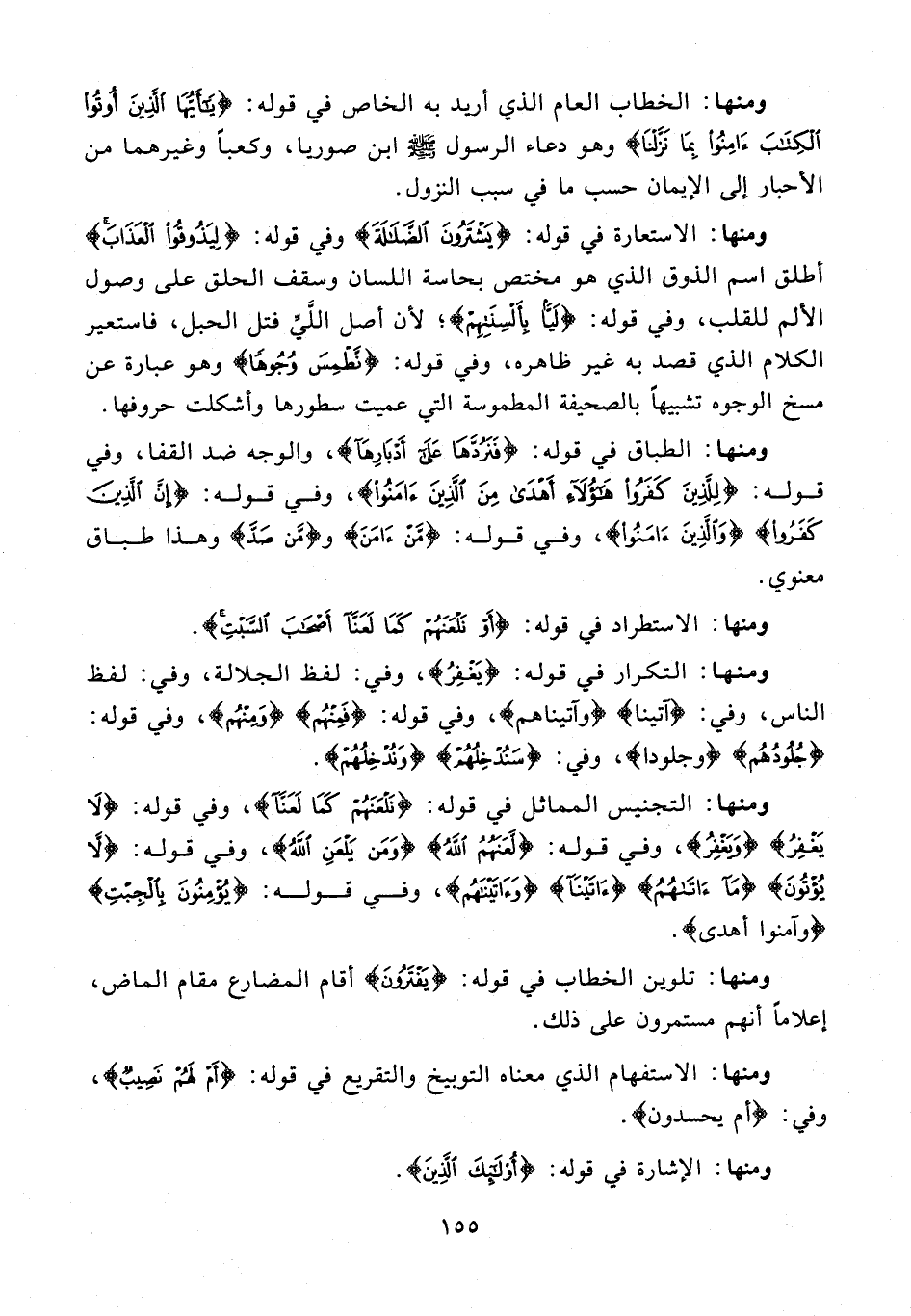 ومنها: الاستعارة في قوله: {يَشْتَرُونَ الضَّلَالَةَ} وفي قوله: {لِيَذُوقُوا الْعَذَابَ} أطلق اسم الذوق الذي هو مختص بحاسة اللسان وسقف الحلق على وصول الألم للقلب، وفي قوله: {لَيًّا بِأَلْسِنَتِهِمْ}؛ لأن أصل اللَّيِّ فتل الحبل، فاستعير الكلام الذي قصد به غير ظاهره، وفي قوله: {نَطْمِسَ وُجُوهًا} وهو عبارة عن مسخ الوجوه تشبيهًا بالصحيفة المطموسة التي عميت سطورها وأشكلت حروفها.