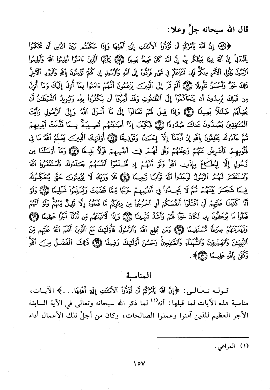 {إِنَّ اللَّهَ يَأْمُرُكُمْ أَنْ تُؤَدُّوا الْأَمَانَاتِ إِلَى أَهْلِهَا وَإِذَا حَكَمْتُمْ بَيْنَ النَّاسِ أَنْ تَحْكُمُوا بِالْعَدْلِ إِنَّ اللَّهَ نِعِمَّا يَعِظُكُمْ بِهِ إِنَّ اللَّهَ كَانَ سَمِيعًا بَصِيرًا (58) يَا أَيُّهَا الَّذِينَ آمَنُوا أَطِيعُوا اللَّهَ وَأَطِيعُوا الرَّسُولَ وَأُولِي الْأَمْرِ مِنْكُمْ فَإِنْ تَنَازَعْتُمْ فِي شَيْءٍ فَرُدُّوهُ إِلَى اللَّهِ وَالرَّسُولِ إِنْ كُنْتُمْ تُؤْمِنُونَ بِاللَّهِ وَالْيَوْمِ الْآخِرِ ذَلِكَ خَيْرٌ وَأَحْسَنُ تَأْوِيلًا (59) أَلَمْ تَرَ إِلَى الَّذِينَ يَزْعُمُونَ أَنَّهُمْ آمَنُوا بِمَا أُنْزِلَ إِلَيْكَ وَمَا أُنْزِلَ مِنْ قَبْلِكَ يُرِيدُونَ أَنْ يَتَحَاكَمُوا إِلَى الطَّاغُوتِ وَقَدْ أُمِرُوا أَنْ يَكْفُرُوا بِهِ وَيُرِيدُ الشَّيْطَانُ أَنْ يُضِلَّهُمْ ضَلَالًا بَعِيدًا (60) وَإِذَا قِيلَ لَهُمْ تَعَالَوْا إِلَى مَا أَنْزَلَ اللَّهُ وَإِلَى الرَّسُولِ رَأَيْتَ الْمُنَافِقِينَ يَصُدُّونَ عَنْكَ صُدُودًا (61) فَكَيْفَ إِذَا أَصَابَتْهُمْ مُصِيبَةٌ بِمَا قَدَّمَتْ أَيْدِيهِمْ ثُمَّ جَاءُوكَ يَحْلِفُونَ بِاللَّهِ إِنْ أَرَدْنَا إِلَّا إِحْسَانًا وَتَوْفِيقًا (62) أُولَئِكَ الَّذِينَ يَعْلَمُ اللَّهُ مَا فِي قُلُوبِهِمْ فَأَعْرِضْ عَنْهُمْ وَعِظْهُمْ وَقُلْ لَهُمْ فِي أَنْفُسِهِمْ قَوْلًا بَلِيغًا (63) وَمَا أَرْسَلْنَا مِنْ رَسُولٍ إِلَّا لِيُطَاعَ بِإِذْنِ اللَّهِ وَلَوْ أَنَّهُمْ إِذْ ظَلَمُوا أَنْفُسَهُمْ جَاءُوكَ فَاسْتَغْفَرُوا اللَّهَ وَاسْتَغْفَرَ لَهُمُ الرَّسُولُ لَوَجَدُوا اللَّهَ تَوَّابًا رَحِيمًا (64) فَلَا وَرَبِّكَ لَا يُؤْمِنُونَ حَتَّى يُحَكِّمُوكَ فِيمَا شَجَرَ بَيْنَهُمْ ثُمَّ لَا يَجِدُوا فِي أَنْفُسِهِمْ حَرَجًا مِمَّا قَضَيْتَ وَيُسَلِّمُوا تَسْلِيمًا (65) وَلَوْ أَنَّا كَتَبْنَا عَلَيْهِمْ أَنِ اقْتُلُوا أَنْفُسَكُمْ أَوِ اخْرُجُوا مِنْ دِيَارِكُمْ مَا فَعَلُوهُ إِلَّا قَلِيلٌ مِنْهُمْ وَلَوْ أَنَّهُمْ فَعَلُوا مَا يُوعَظُونَ بِهِ لَكَانَ خَيْرًا لَهُمْ وَأَشَدَّ تَثْبِيتًا (66) وَإِذًا لَآتَيْنَاهُمْ مِنْ لَدُنَّا أَجْرًا عَظِيمًا (67) وَلَهَدَيْنَاهُمْ صِرَاطًا مُسْتَقِيمًا (68) وَمَنْ يُطِعِ اللَّهَ وَالرَّسُولَ فَأُولَئِكَ مَعَ الَّذِينَ أَنْعَمَ اللَّهُ عَلَيْهِمْ مِنَ النَّبِيِّينَ وَالصِّدِّيقِينَ وَالشُّهَدَاءِ وَالصَّالِحِينَ وَحَسُنَ أُولَئِكَ رَفِيقًا (69) ذَلِكَ الْفَضْلُ مِنَ اللَّهِ وَكَفَى بِاللَّهِ عَلِيمًا (70)}.