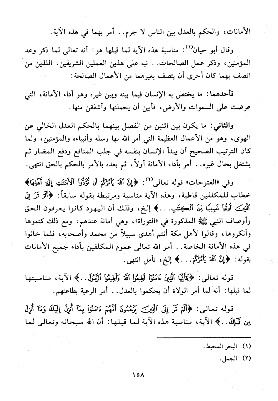 وفي "الفتوحات" قوله تعالى (¬2): {إِنَّ اللَّهَ يَأمُرُكُمْ أَنْ تُؤَدُّوا الْأَمَانَاتِ إِلَى أَهْلِهَا} خطاب للمكلفين قاطبة، وهذه الآية مناسبة ومرتبطة بقوله سابقًا: {أَلَمْ تَرَ إِلَى الَّذِينَ أُوتُوا نَصِيبًا مِنَ الْكِتَابِ ...} إلخ، وذلك أن اليهود كانوا يعرفون الحق وأوصاف النبي - صلى الله عليه وسلم - المذكورة في "التوراة"، وهي أمانة عندهم، ومع ذلك كتموها وأنكروها، وقالوا لأهل مكة أنتم أهدى سبيلًا من محمَّد وأصحابه، فلما خانوا في هذه الأمانة الخاصة .. أمر الله تعالى عموم المكلفين بأداء جميع الأمانات بقوله: {إِنَّ اللَّهَ يَأمُرُكُمْ ...} إلخ، تأمل انتهى.