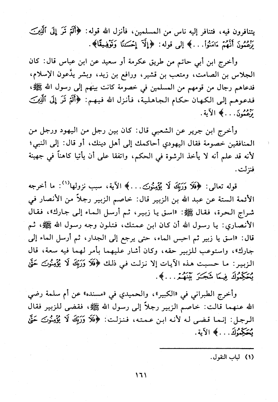 وأخرج ابن جرير عن الشعبي قال: كان بين رجل من اليهود ورجل من المنافقين خصومة فقال اليهودي أحاكمك إلى أهل دينك، أو قال: إلى النبي؛ لأنه قد علم أنه لا يأخذ الرشوة في الحكم، واتفقا على أن يأتيا كاهنًا في جهينة فنزلت.