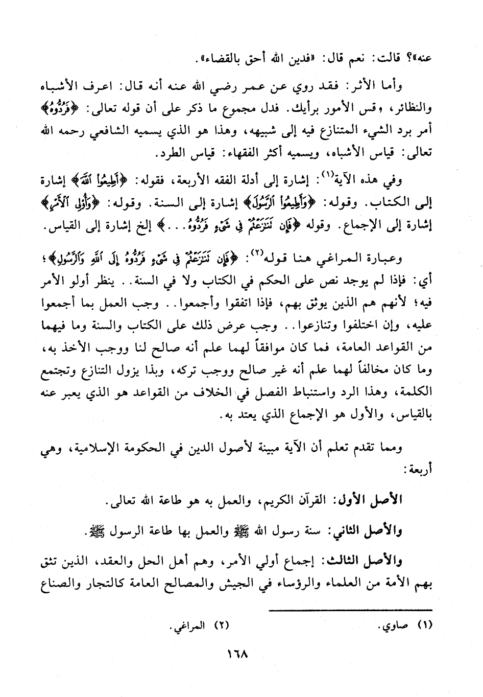 وعبارة المراغي هنا قوله (¬2): {فَإِنْ تَنَازَعْتُمْ فِي شَيْءٍ فَرُدُّوهُ إِلَى اللَّهِ وَالرَّسُولِ}؛ أي: فإذا لم يوجد نص على الحكم في الكتاب ولا في السنة .. ينظر أولو الأمر فيه؛ لأنهم هم الذين يوثق بهم، فإذا اتفقوا وأجمعوا .. وجب العمل بما أجمعوا عليه، وإن اختلفوا وتنازعوا .. وجب عرض ذلك على الكتاب والسنة وما فيهما من القواعد العامة، فما كان موافقًا لهما علم أنه صالح لنا ووجب الأخذ به، وما كان مخالفًا لهما علم أنه غير صالح ووجب تركه، وبذا يزول التنازع وتجتمع الكلمة، وهذا الرد واستنباط الفصل في الخلاف من القواعد هو الذي يعبر عنه بالقياس، والأول هو الإجماع الذي يعتد به.
