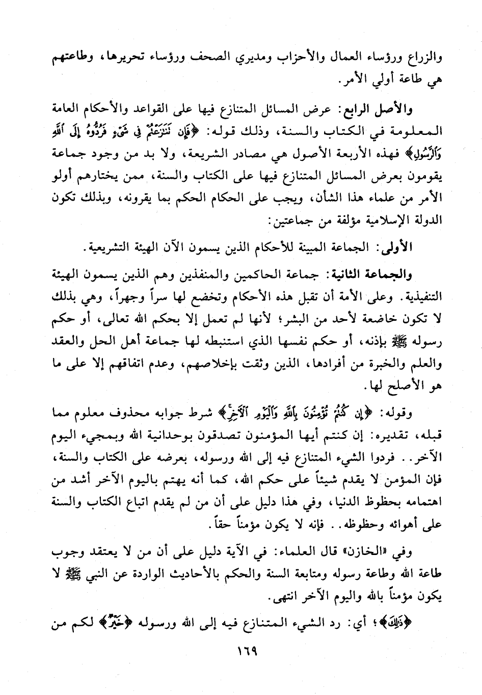 والأصل الرابع: عرض المسائل المتنازع فيها على القواعد والأحكام العامة المعلومة في الكتاب والسنة، وذلك قوله: {فَإِنْ تَنَازَعْتُمْ فِي شَيْءٍ فَرُدُّوهُ إِلَى اللَّهِ وَالرَّسُولِ} فهذه الأربعة الأصول هي مصادر الشريعة، ولا بد من وجود جماعة يقومون بعرض المسائل المتنازع فيها على الكتاب والسنة، ممن يختارهم أولو الأمر من علماء هذا الشأن، ويجب على الحكام الحكم بما يقرونه، وبذلك تكون الدولة الإِسلامية مؤلفة من جماعتين: