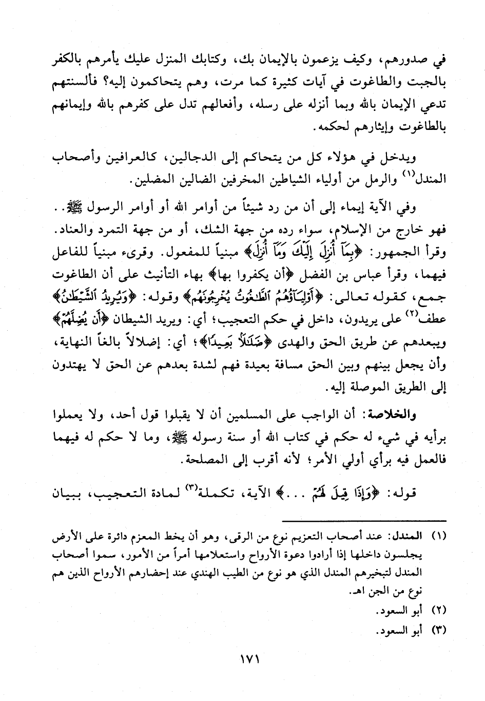 (¬1) المندل: عند أصحاب التعزيم نوع من الرقى، وهو أن يخط المعزم دائرة على الأرض يجلسون داخلها إذا أرادوا دعوة الأرواح واستعلامها أمرًا من الأمور، سموا أصحاب المندل لتبخيرهم المندل الذي هو نوع من الطيب الهندي عند إحضارهم الأرواح الذين هم نوع من الجن اهـ.