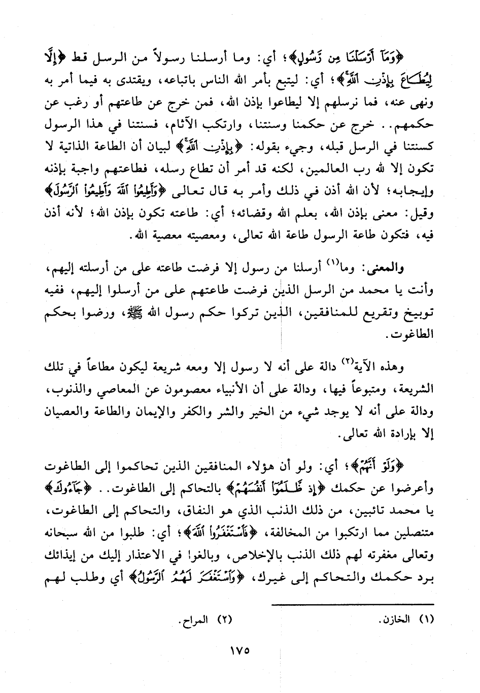 وهذه الآية (¬2) دالة على أنه لا رسول الله ومعه شريعة ليكون مطاعًا في تلك الشريعة، ومتبوعًا فيها، ودالة على أن الأنبياء معصومون عن المعاصي والذنوب، ودالة على أنه لا يوجد شيء من الخير والشر والكفر والإيمان والطاعة والعصيان إلا بإرادة الله تعالى.