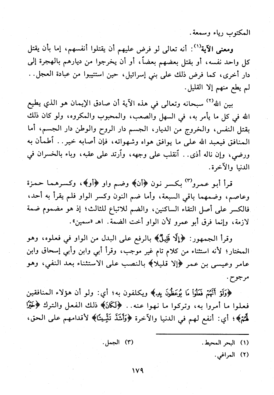 ومعنى الآية (¬1)؛ أنه تعالى لو فرض عليهم أن يقتلوا أنفسهم، إما بأن يقتل كل واحد نفسه، أو بقتل بعضهم بعضًا، أو أن يخرجوا من ديارهم بالهجرة إلى دار أخرى، كما فرض ذلك على بني إسرائيل، حين استتيبوا من عبادة العجل .. لم يطع منهم إلا القليل.