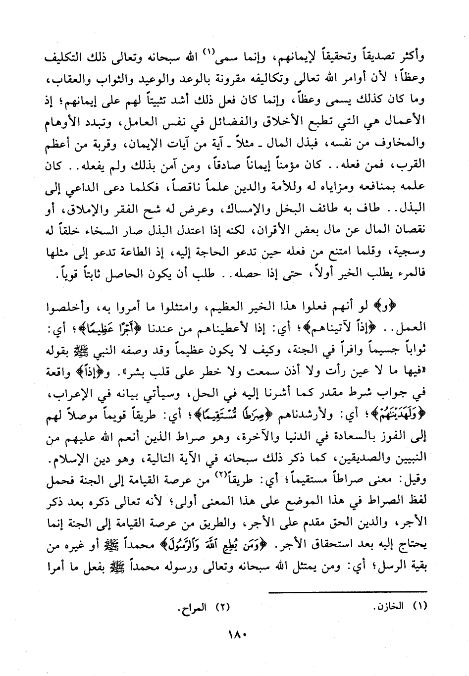 68 - {وَلَهَدَيْنَاهُم}؛ أي: ولأرشدناهم {صِرَاطًا مُسْتَقِيمًا}؛ أي: طريقًا قويمًا موصلًا لهم إلى الفوز بالسعادة في الدنيا والآخرة، وهو صراط الذين أنعم الله عليهم من النبيين والصديقين، كما ذكر ذلك سبحانه في الآية التالية، وهو دين الإِسلام. وقيل: معنى صراطًا مستقيمًا؛ أي: طريقًا (¬2) من عرصة القيامة إلى الجنة فحمل لفظ الصراط في هذا الموضع على هذا المعنى أولى؛ لأنه تعالى ذكره بعد ذكر الأجر، والدين الحق مقدم على الأجر، والطريق من عرصة القيامة إلى الجنة إثما يحتاج إليه بعد استحقاق الأجر.