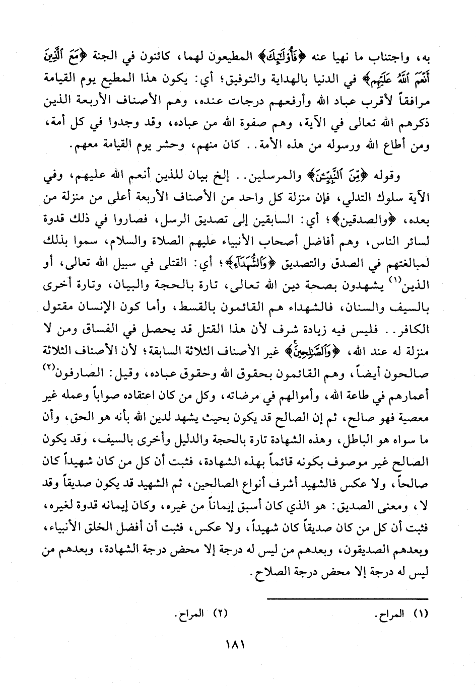 وقوله {مِنَ النَّبِيِّينَ} والمرسلين .. إلخ بيان للذين أنعم الله عليهم، وفي الآية سلوك التدلي، فإن منزلة كل واحد من الأصناف الأربعة أعلى من منزلة من بعده، {وَالصِّدِّيقِينَ}؛ أي: السابقين إلى تصديق الرسل، فصاروا في ذلك قدوة لسائر الناس، وهم أفاضل أصحاب الأنبياء عليهم الصلاة والسلام، سموا بذلك لمبالغتهم في الصدق والتصديق {وَالشُّهَدَاءِ} أي: القتلى في سبيل الله تعالى، أو الذين (¬1) يشهدون بصحة دين الله تعالى، تارة بالحجة والبيان، وتارة أخرى بالسيف والسنان، فالشهداء هم القائمون بالقسط، وأما كون الإنسان مقتول الكافر .. فليس فيه زيادة شرف لأن هذا القتل قد يحصل في الفساق ومن لا منزلة له عند الله، {وَالصَّالِحِينَ} غير الأصناف الثلاثة السابقة؛ لأن الأصناف الثلاثة صالحون أيضًا، وهم القائمون بحقوق الله وحقوق عباده، وقيل: الصارفون (¬2) أعمارهم في طاعة الله، وأموالهم في مرضاته، وكل من كان اعتقاده صوبًا وعمله غير معصية فهو صالح، ثم إن الصالح قد يكون بحيث يشهد لدين الله بأنه هو الحق، وأن ما سواه هو الباطل، وهذه الشهادة تارة بالحجة والدليل وأخرى بالسيف، وقد يكون الصالح غير موصوف بكونه قائمًا بهذه الشهادة، فثبت أن كل من كان شهيدًا كان صالحًا، ولا عكس فالشهيد أشرف أنواع الصالحين، ثم الشهيد قد يكون صديقًا وقد لا، ومعنى الصديق: هو الذي كان أسبق إيمانًا من غيره، وكان إيمانه قدوة لغيره، فثبت أن كل من كان صديقًا كان شهيدًا، ولا عكس، فثبت أن أفضل الخلق الأنبياء، وبعدهم الصديقون، وبعدهم من ليس له درجة إلا محض درجة الشهادة، وبعدهم من ليس له درجة إلا محض درجة الصلاح.