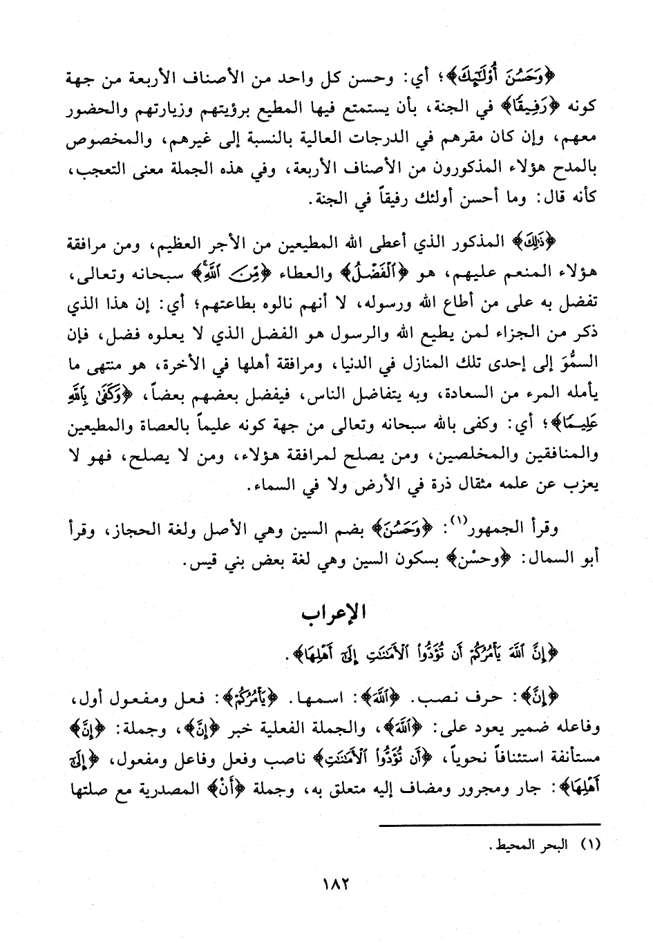 {وَحَسُنَ أُولَئِكَ}؛ أي: وحسن كل واحد من الأصناف الأربعة من جهة كونه {رَفِيقًا} في الجنة، بأن يستمتع فيها المطيع برؤيتهم وزيارتهم والحضور معهم، وإن كان مقرهم في الدرجات العالية بالنسبة إلى غيرهم، والمخصوص بالمدح هؤلاء المذكورون من الأصناف الأربعة، وفي هذه الجملة معنى التعجب، كأنه قال: وما أحسن أولئك رفيقًا في الجنة.