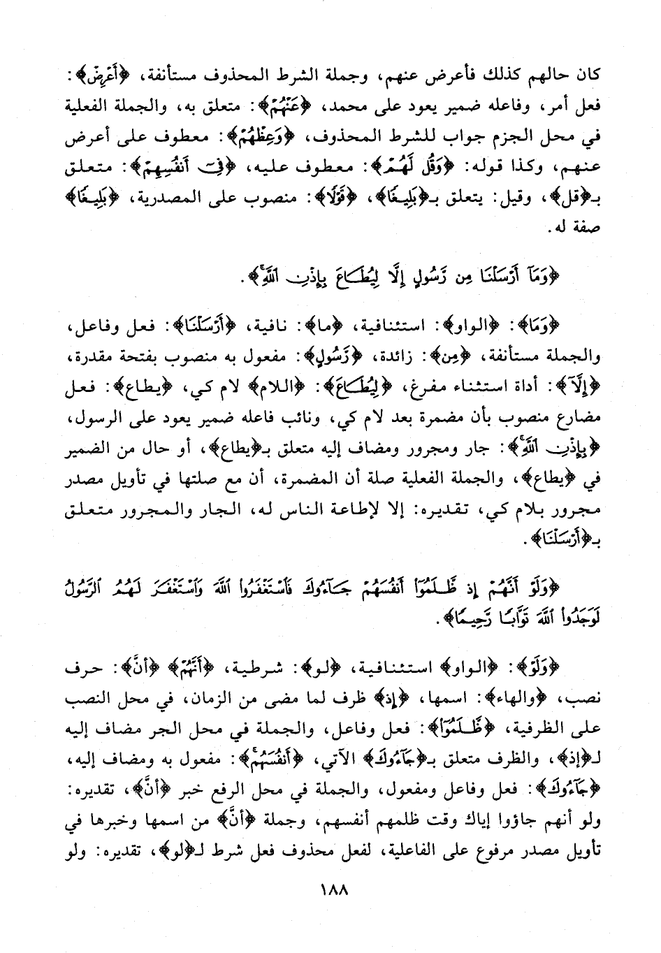 {وَمَا}: {الواو}: استئنافية، {ما}: نافية، {أَرْسَلْنَا}: فعل وفاعل، والجملة مستأنفة، {مِنْ}: زائدة، {رَسُولٍ}: مفعول به منصوب بفتحة مقدرة، {إِلَّا}: أداة استثناء مفرغ، {لِيُطَاعَ}: {اللام} لام كي، {يطاع}: فعل مضارع منصوب بأن مضمرة بعد لام كي، ونائب فاعله ضمير يعود على الرسول، {بِإِذْنِ اللَّهِ}: جار ومجرور ومضاف إليه متعلق بـ ـ {يطاع}، أو حال من الضمير في {يطاع}، والجملة الفعلية صلة أن المضمرة، أن مع صلتها في تأويل مصدر مجرور بلام كي، تقديره: إلا لإطاعة الناس له، الجار والمجرور متعلق بـ ـ {أَرْسَلْنَا}.