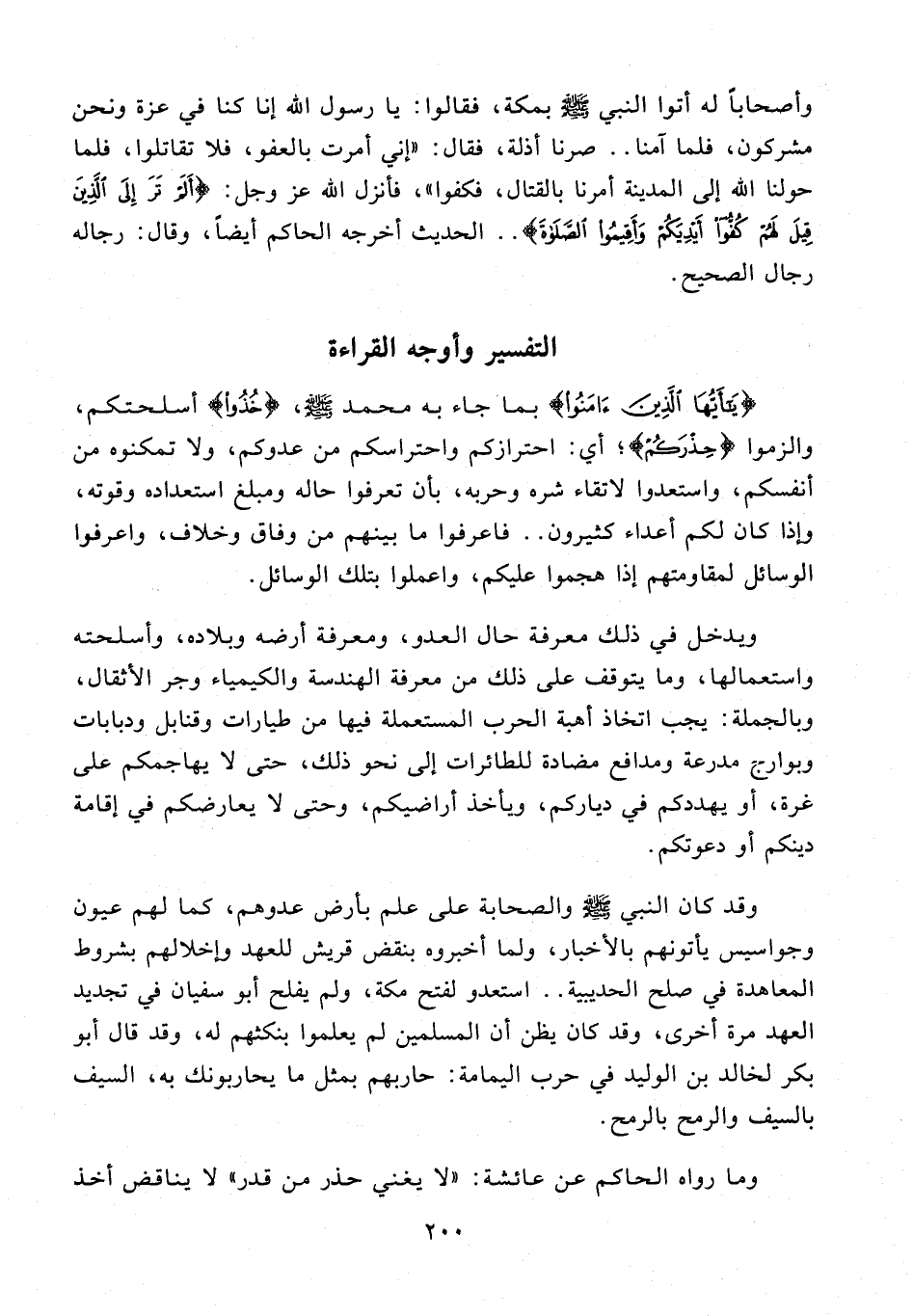 71 - {يَا أَيُّهَا الَّذِينَ آمَنُوا} بما جاء به محمد - صلى الله عليه وسلم -، {خُذُوا} أسلحتكم، والزموا {حِذْرَكُمْ}؛ أي: احترازكم واحتراسكم من عدوكم، ولا تمكنوه من أنفسكم، واستعدوا لاتقاء شره وحربه، بأن تعرفوا حاله ومبلغ استعداده وقوته، وإذا كان لكم أعداء كثيرون .. فاعرفوا ما بينهم من وفاق وخلاف، واعرفوا الوسائل لمقاومتهم إذا هجموا عليكم، واعملوا بتلك الوسائل.