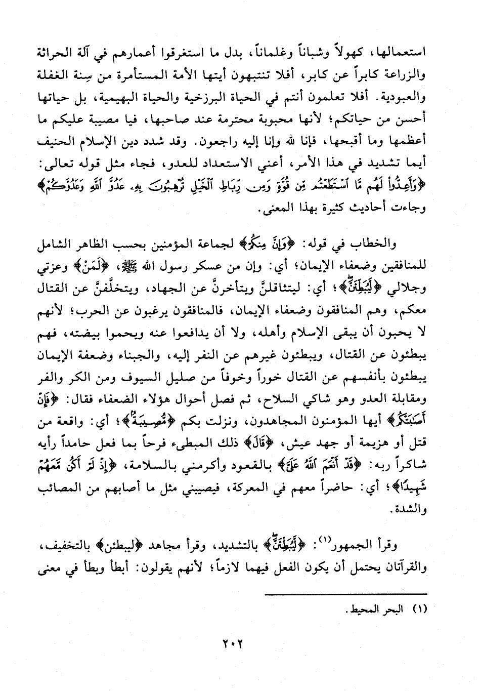 72 - والخطاب في قوله: {وَإِنَّ مِنْكُمْ} لجماعة المؤمنين بحسب الظاهر الشامل للمنافقين وضعفاء الإيمان؛ أي: وإن من عسكر رسول الله - صلى الله عليه وسلم -، {لَمَنْ} وعزتي وجلالي {لَيُبَطِّئَنَّ}؛ أي: ليتثاقلنَّ ويتأخرنَّ عن الجهاد، ويتخلَّفنَّ عن القتال معكم، وهم المنافقون وضعفاء الإيمان، فالمنافقون يرغبون عن الحرب؛ لأنهم لا يحبون أن يبقى الإِسلام وأهله، ولا أن يدافعوا عنه ويحموا بيضته، فهم يبطئون عن القتال، ويبطئون غيرهم عن النفر إليه، والجبناء وضعفة الإيمان يبطئون بأنفسهم عن القتال خورًا وخوفًا من صليل السيوف ومن الكر والفر ومقابلة العدو وهو شاكي السلاح، ثم فصل أحوال هؤلاء الضعفاء فقال: {فَإِنْ أَصَابَتْكُمْ} أيها المؤمنون المجاهدون، ونزلت بكم {مُصِيبَةٌ}؛ أي: واقعة من قتل أو هزيمة أو جهد عيش، {قَال} ذلك المبطىء فرحًا بما فعل حامدًا رأيه شاكرًا ربه: {قَدْ أَنْعَمَ اللَّهُ عَلَيَّ} بالقعود وأكرمني بالسلامة، {إِذْ لَمْ أَكُنْ مَعَهُمْ شَهِيدًا}؛ أي: حاضرًا معهم في المعركة، فيصيبني مثل ما أصابهم من المصائب والشدة.