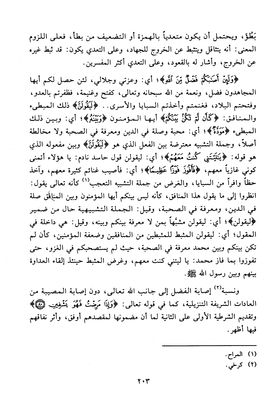 73 - {وَلَئِنْ أَصَابَكُمْ فَضْلٌ مِنَ اللَّهِ}؛ أي: وعزتي وجلالي، لئن حصل لكم أيها المجاهدون فضل، ونعمة من الله سبحانه وتعالى، كفتح وغنيمة، فظفرتم بالعدو، وفتحتم البلاد، فغنمتم وأخذتم السبايا والأسرى .. {لَيَقُولَنَّ} ذلك المبطىء والمنافق: {كَأَنْ لَمْ تَكُنْ بَيْنَكُمْ} أيها المؤمنون {وَبَيْنَهُ}؛ أي: وبين ذلك المبطىء {مَوَدَّةٌ}؛ أي: محبة وصلة في الدين ومعرفة في الصحبة ولا مخالطة أصلًا، وجملة التشبيه معترضة بين الفعل الذي هو {لَيَقُولَن} وبين مفعوله الذي هو قوله: {يَا لَيْتَنِي كُنْتُ مَعَهُمْ}؛ أي: ليقولن قول حاسد نادم: يا هؤلاء أتمنى كوني غازيًا معهم، {فَأَفُوزَ فَوْزًا عَظِيمًا}؛ أي: فأصيب غنائم كثيرة معهم، وآخذ حظًّا وافرًا من السبايا، والغرض من جملة التشبيه التعجب (¬1) كأنه تعالى يقول: انظروا إلى ما يقول هذا المنافق، كأنه ليس بينكم أيها المؤمنون وبين المنافق صلة في الدين، ومعرفة في الصحبة، وقيل: الجملة التشبيهية حال من ضمير {ليقولن}؛ أي: ليقولن مشبَّهًا بمن لا معرفة بينكم وبينه، وقيل: هي داخلة في المقول؛ أي: ليقولن المثبط للمثبطين من المنافقين وضعفة المؤمنين، كأن لم تكن بينكم وبين محمد معرفة في الصحبة، حيث لم يستصحبكم في الغزو، حتى تفوزوا بما فاز محمد: يا ليتني كنت معهم، وغرض المثبط حينئذ إلقاء العداوة بينهم وبين رسول الله - صلى الله عليه وسلم -.
