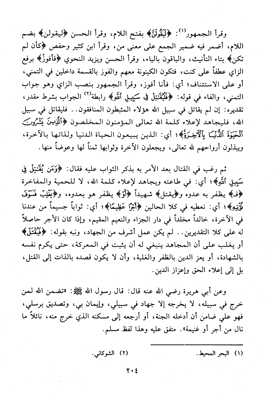 74 - والفاء في قوله: {فَلْيُقَاتِلْ فِي سَبِيلِ اللَّهِ} رابطة (¬2) الجواب بشرط مقدر، تقديره: إن لم يقاتل في سبيل الله هؤلاء المثبطون المنافقون .. فليقاتل في سبيل الله، فليجاهد لإعلاء كلمة الله تعالى المؤمنون المخلصون {الَّذِينَ يَشْرُونَ الْحَيَاةَ الدُّنْيَا بِالْآخِرَةِ}؛ أي: الذين يبيعون الحياة الدنيا ولذاتها بالآخرة، ويبذلون أرواحهم لله تعالى، ويجعلون الآخرة وثوابها ثمنًا لها وعوضًا منها.